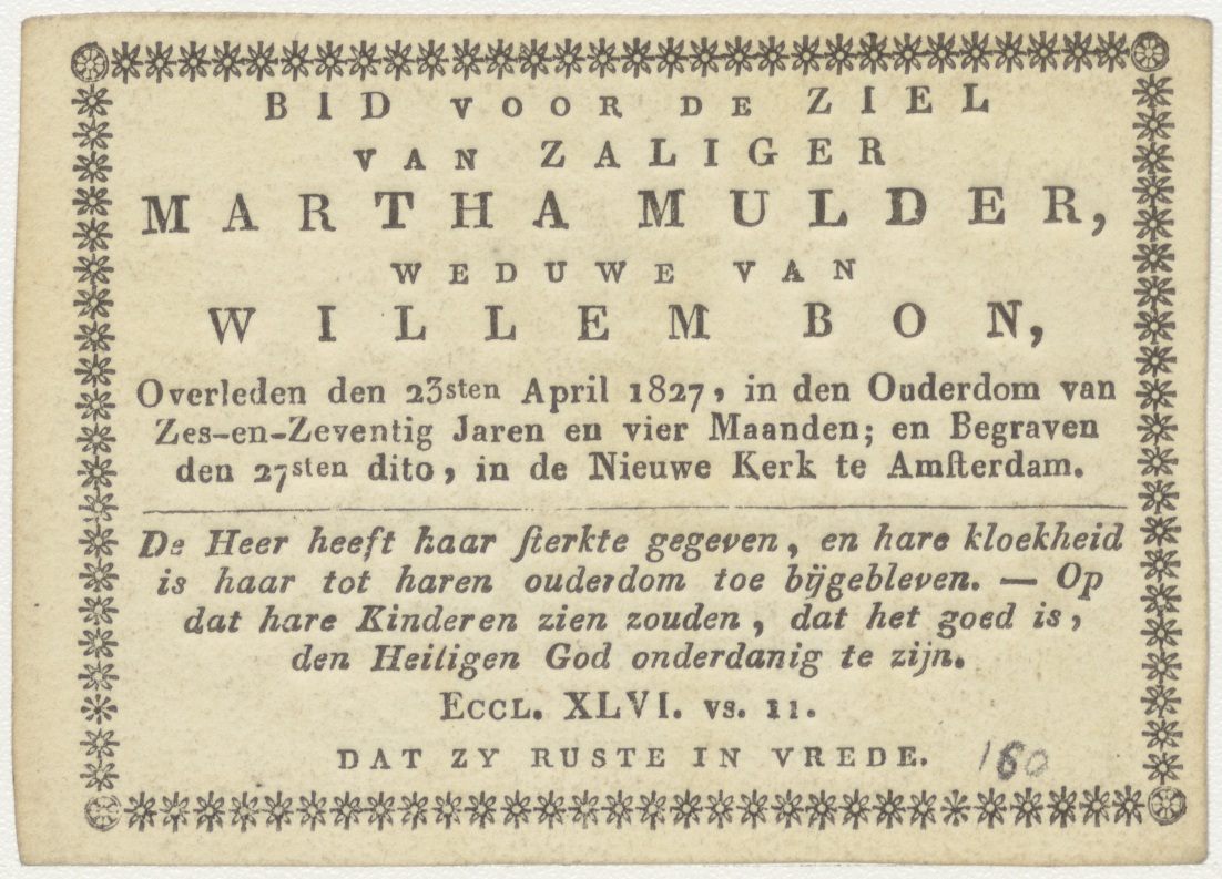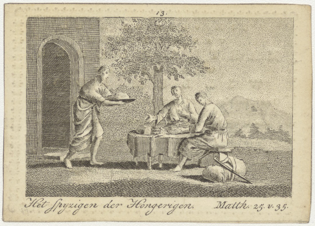 Het spijzigen der Hongerigen (Mat.25:35), kz. Bid voor ziel Martha Mulder (+1827) Amsterdam, weduwe van Willem Bon