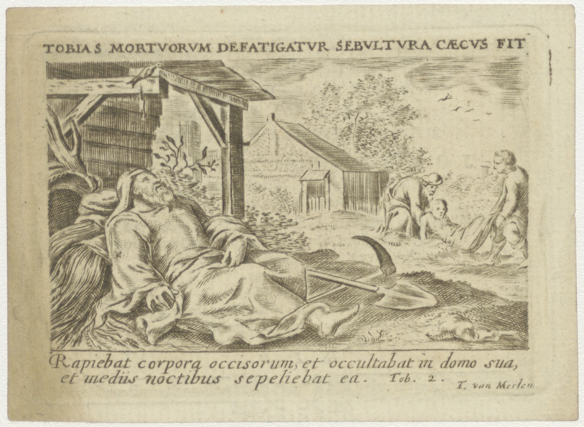 Tobias en Tobit begraven de dode, kz. Religieus; bid voor ziel Johannes Mulder (+1822) Haarlem, priester, kapellaan te Amsterdam