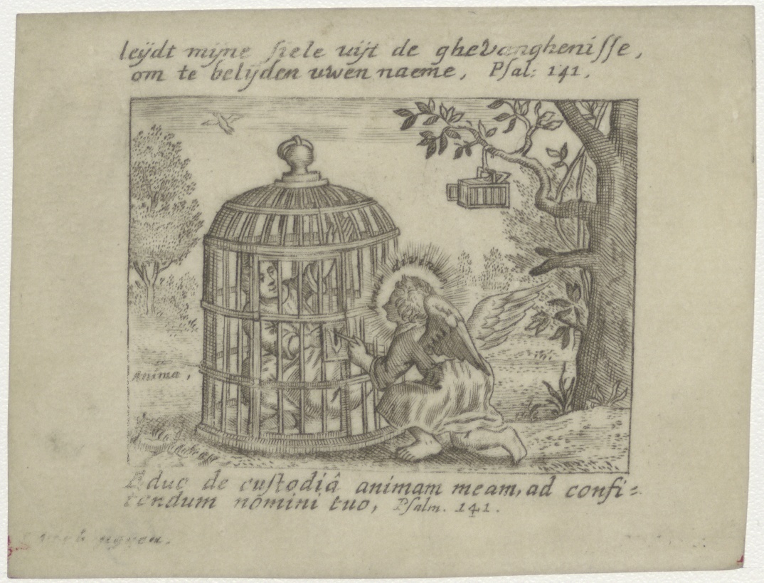 Amor divinus en Anima in kooi, met "leidt mijn siele uijt de ghevanghenisse, ..." (Psal.141)