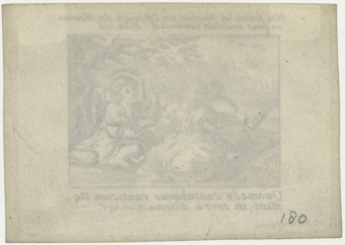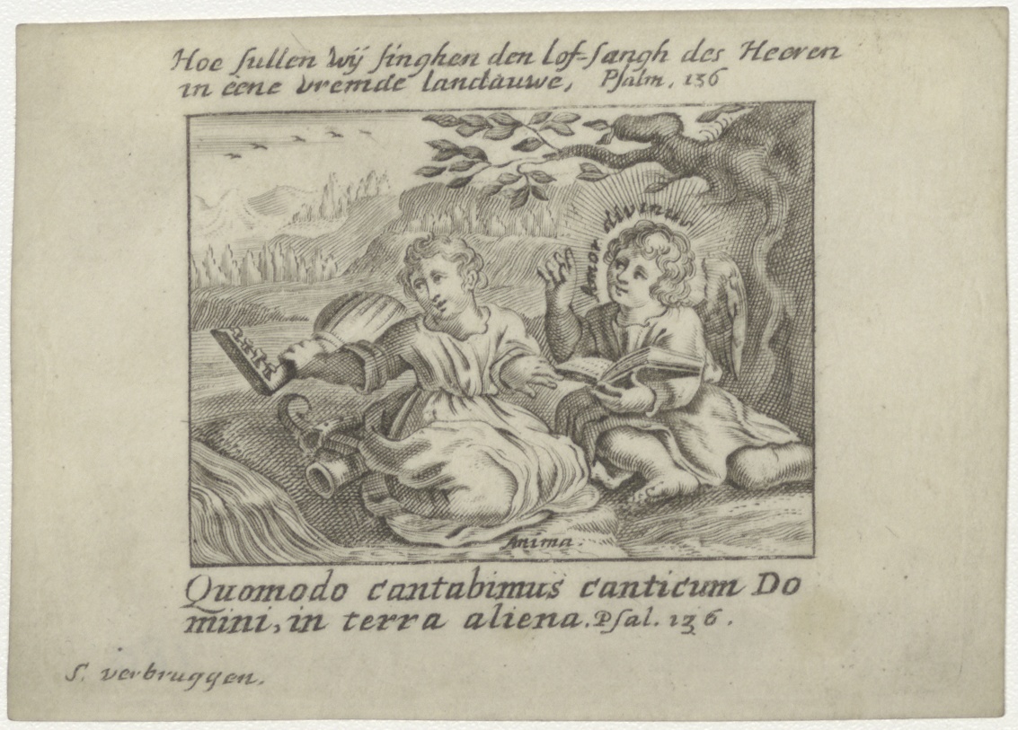 Amor divinus met boek en Anima met muziekinstrumenten, met "Hoe sullen wij singhen den lof-sangh des Heeren ..." (Psal.136)