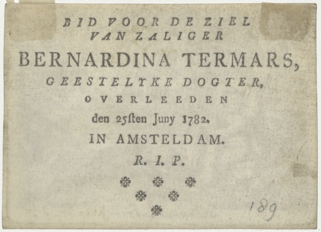 Johannes de Doper, kz. Religieus;Bid voor ziel Bernardina Termars (+1782), geestelijk dochter, Amsterdam