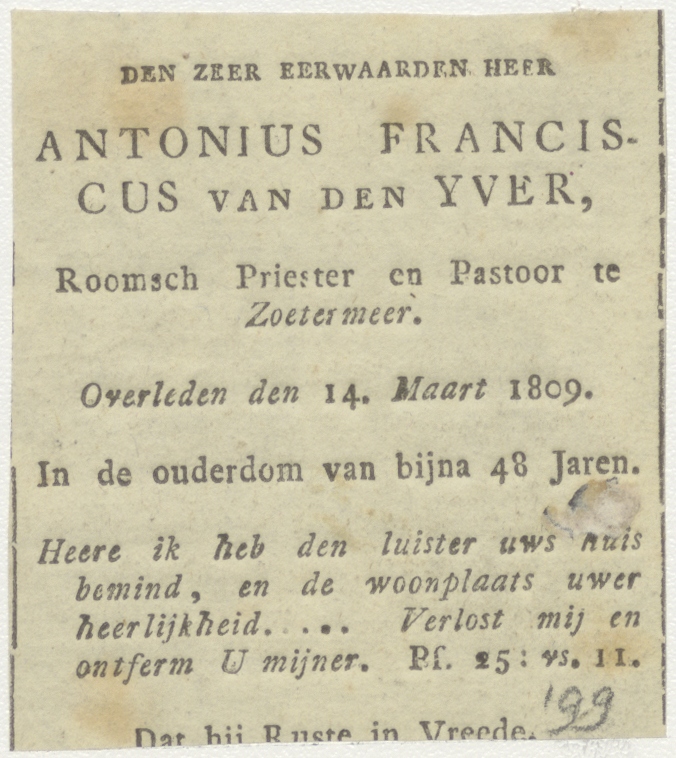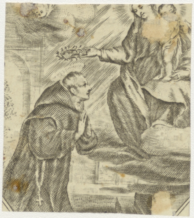 Geknielde H. Lodewijk van Toulouse ontvangt doornenkroon van Maria met kind, kz. Religieus; bid voor ziel Antonius Franciscus van den Yver (+1809) Zoetermeer, priester en pastoor