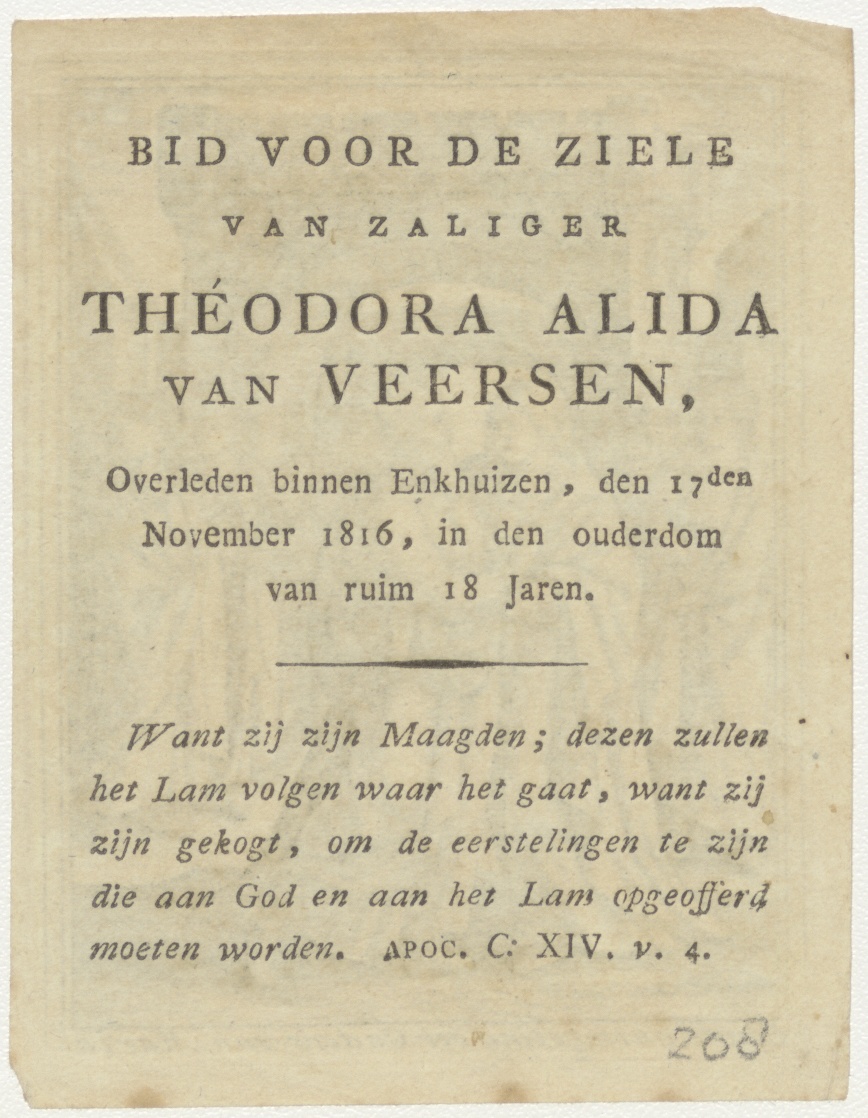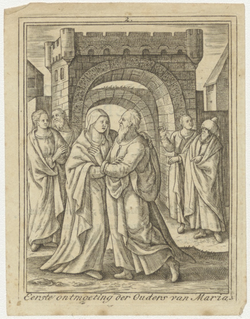 Het leven der Heilige Maagd Maria (serie): 2. Eerste ontmoeting der ouders van Maria, kz. Bid voor ziel Théodora Alida van Veersen (+1816) Enkhuizen