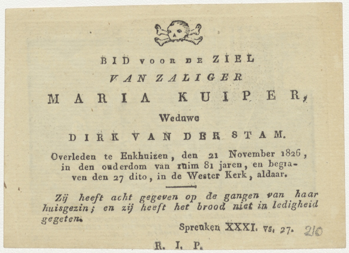 Kind wordt door de dood weggevoerd uit het gezin, cunctos mors una manet, kz. Bid voor ziel Maria Kuiper (+1826) Enkhuizen