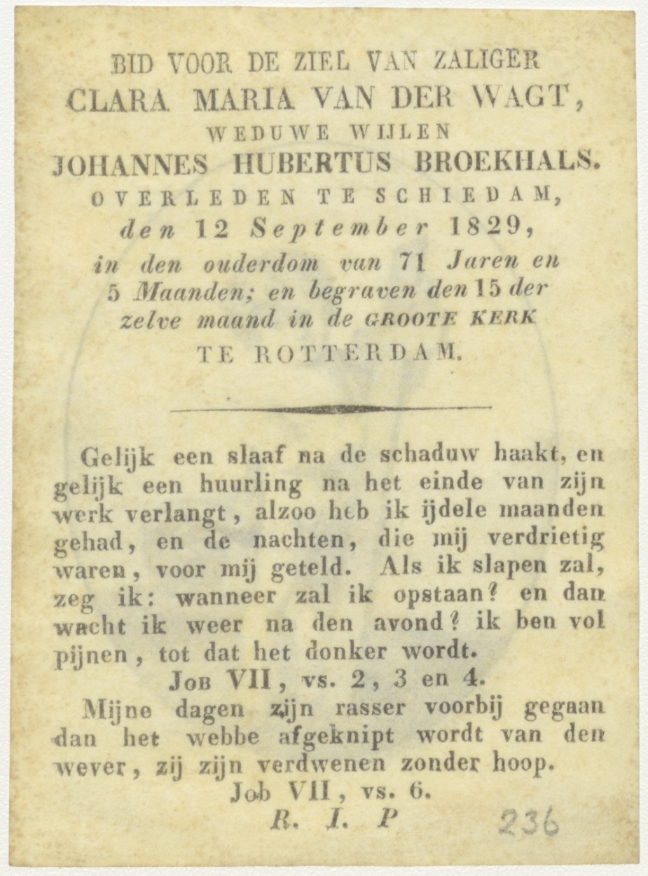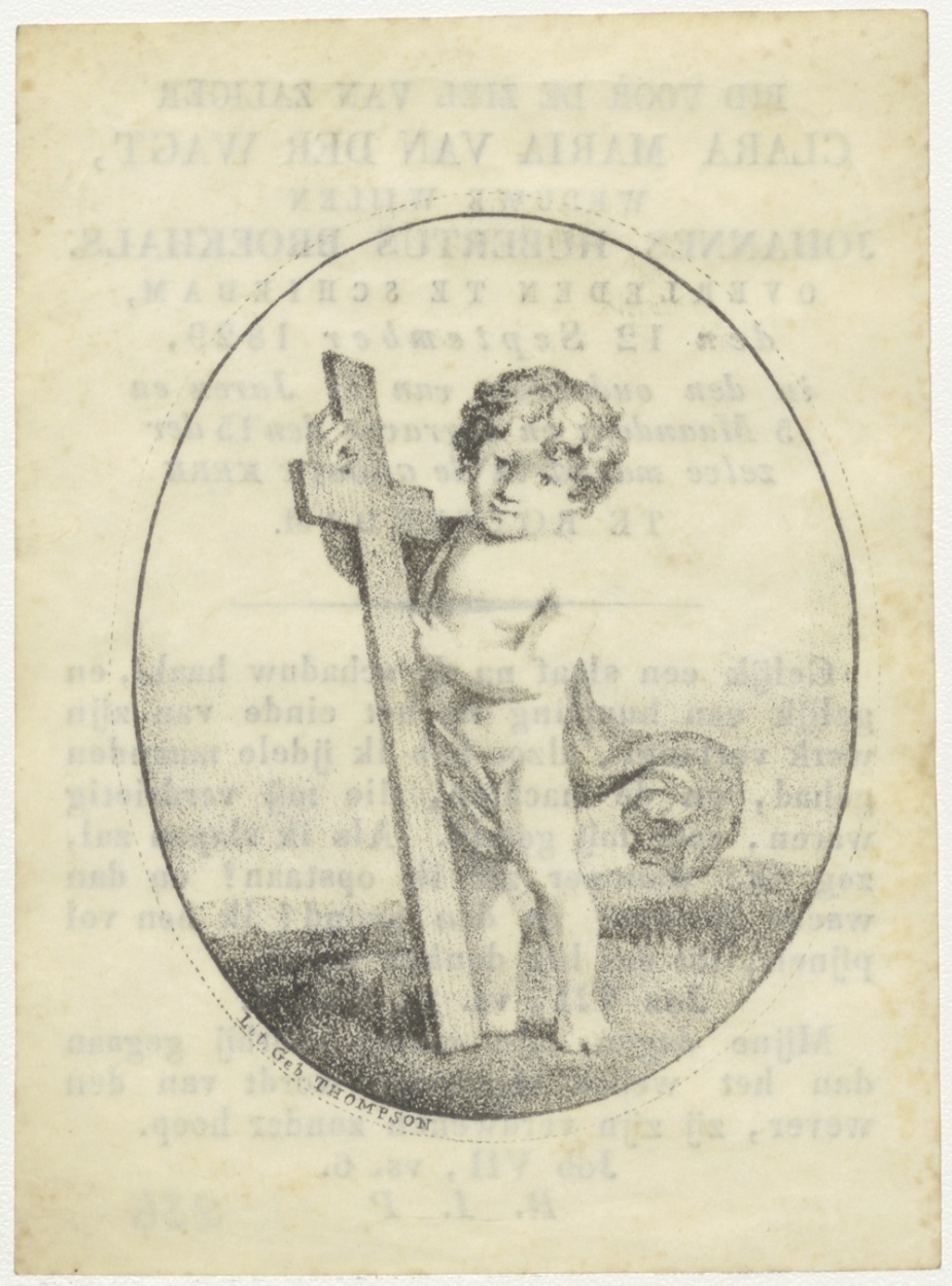 Christuskind met kruis, kz. bid voor ziel Clara Maria van der Wagt (+1829) Schiedam, begraven Rotterdam, weduwe van Johannes Hubertus Broekhals