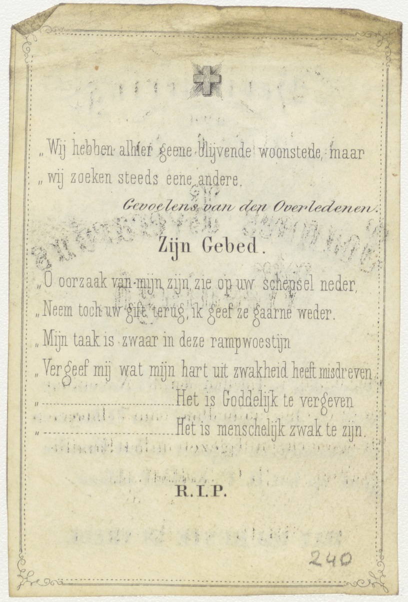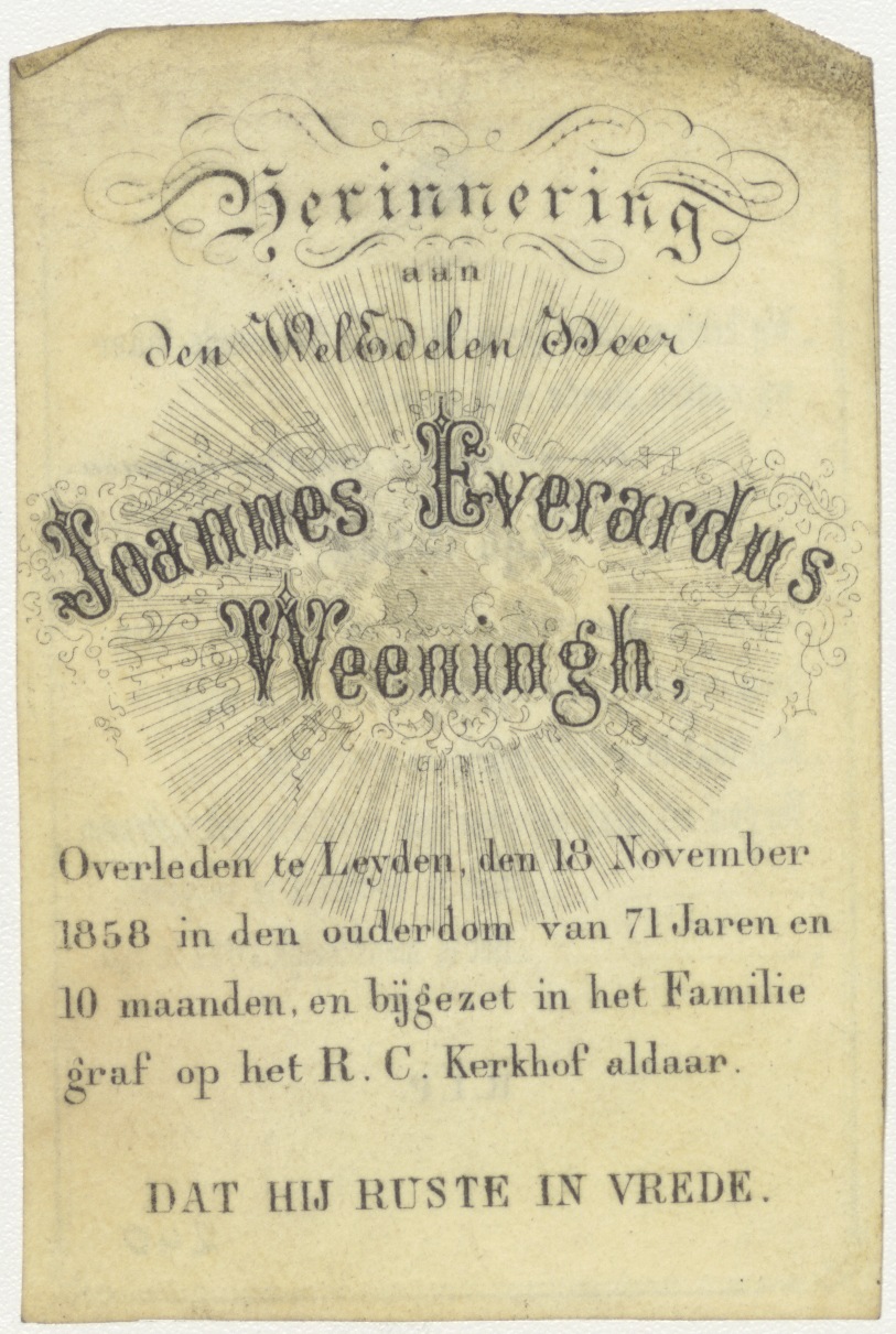 Herinnering aan ... Joannes Everardus Weeningh (+1858) Leiden, kz. tekst