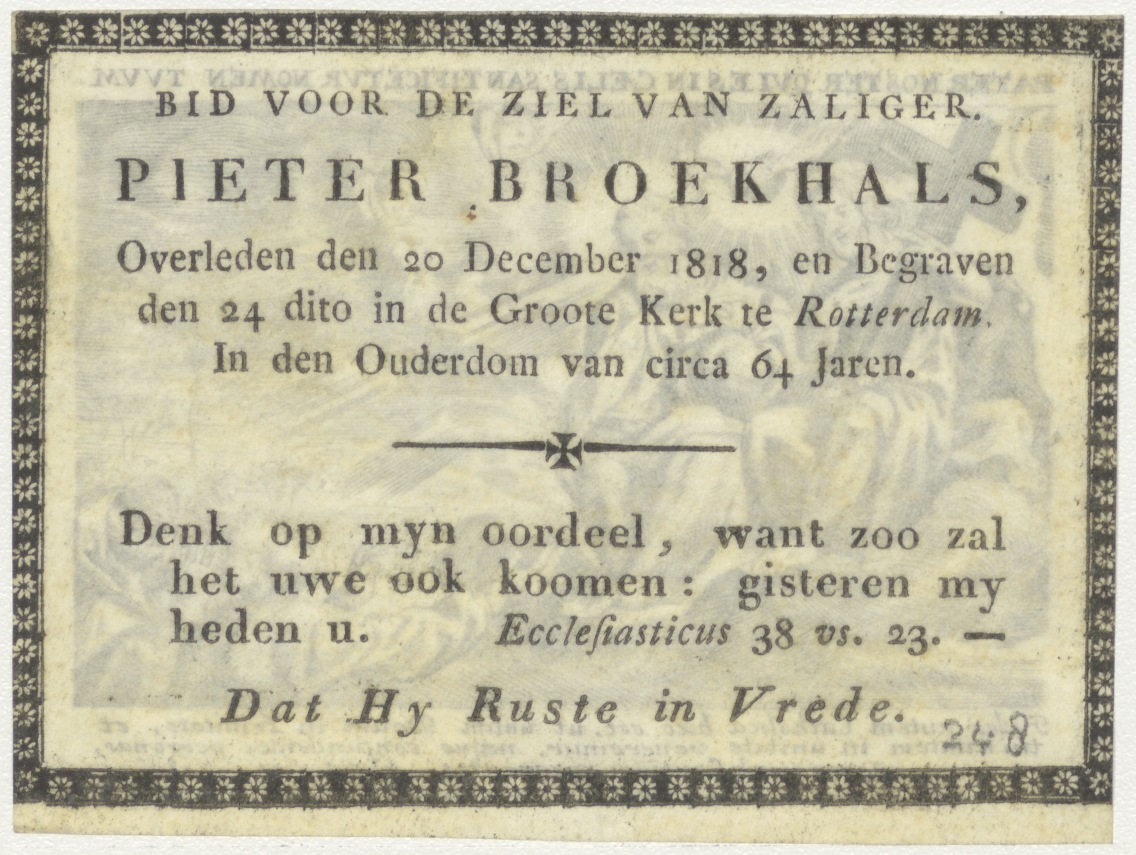 Onze vader die in de hemelen zijt geheiligd zij uw naam, kz. Bid voor ziel Pieter Broekhals (+1818)