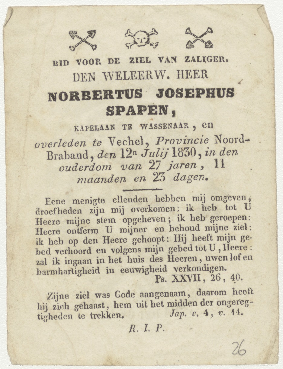 H. Maria genitrix, kz. religieus;bid voor ziel Norbertus Spapen (+1830 kapelaan te Wassenaar