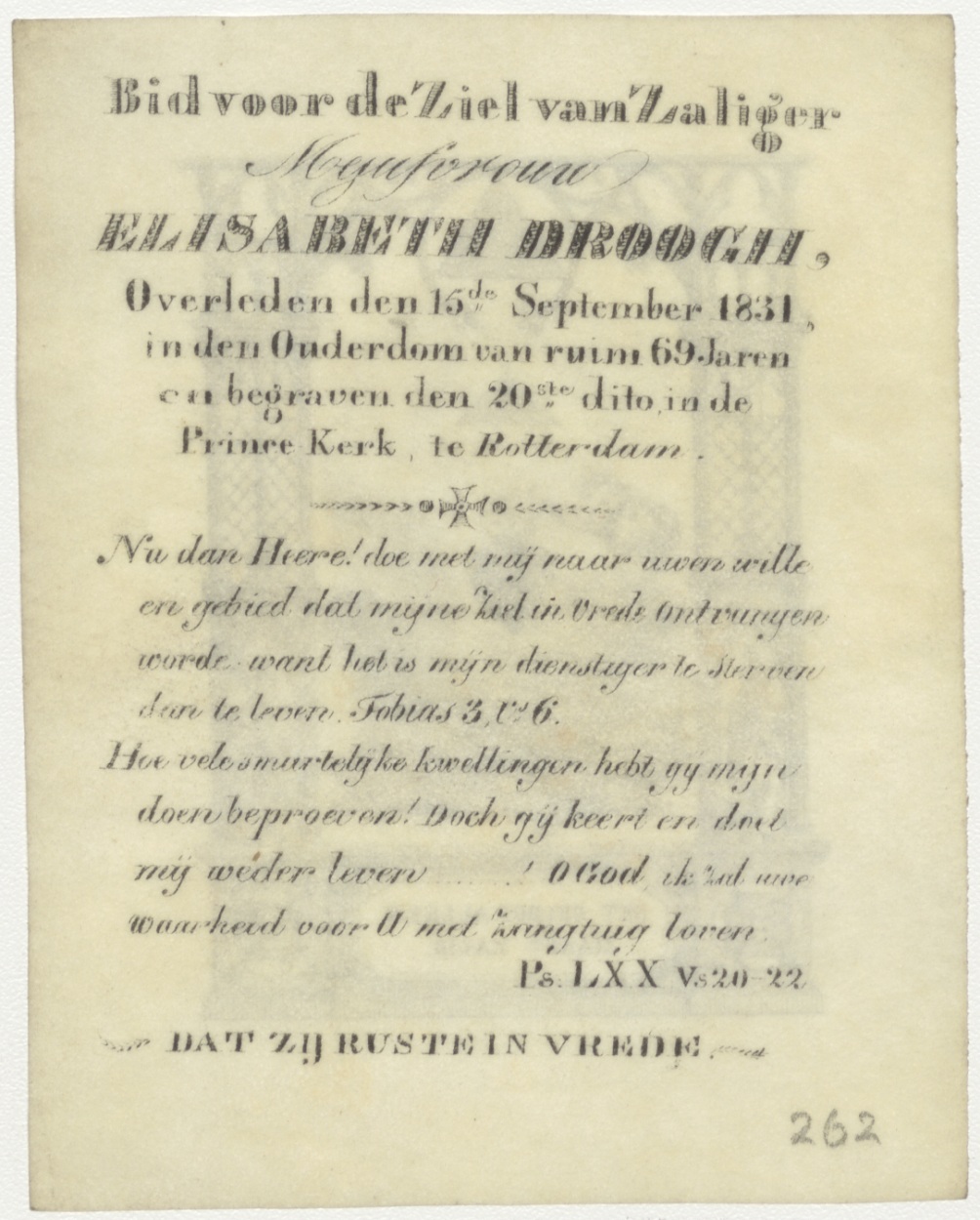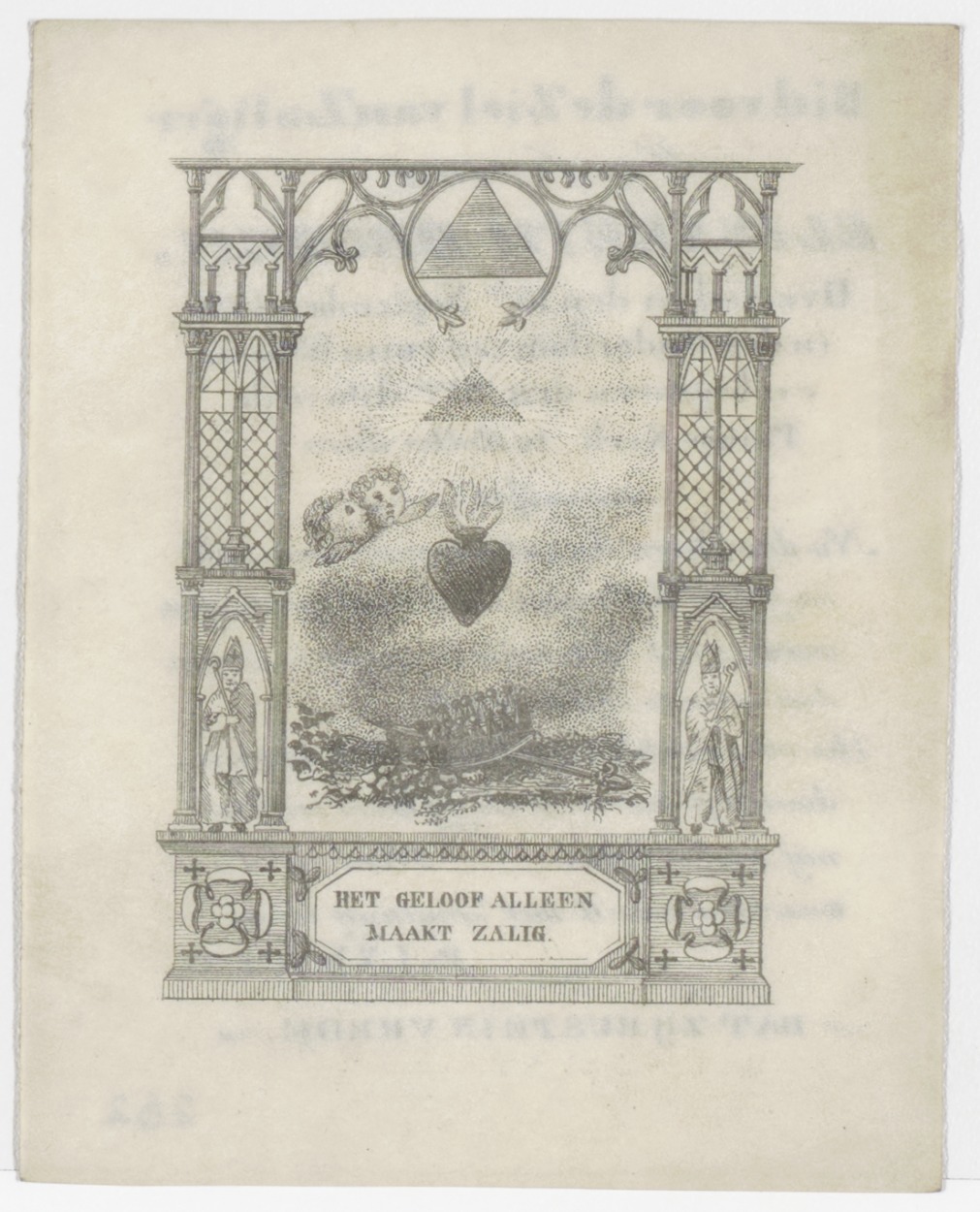 Het geloof alleen maakt zalig, met zwaard en kroon onder H. Hart en Alziend Oog,, kz. Bid voor ziel Elisabeth Droogh (+1831) Rotterdam