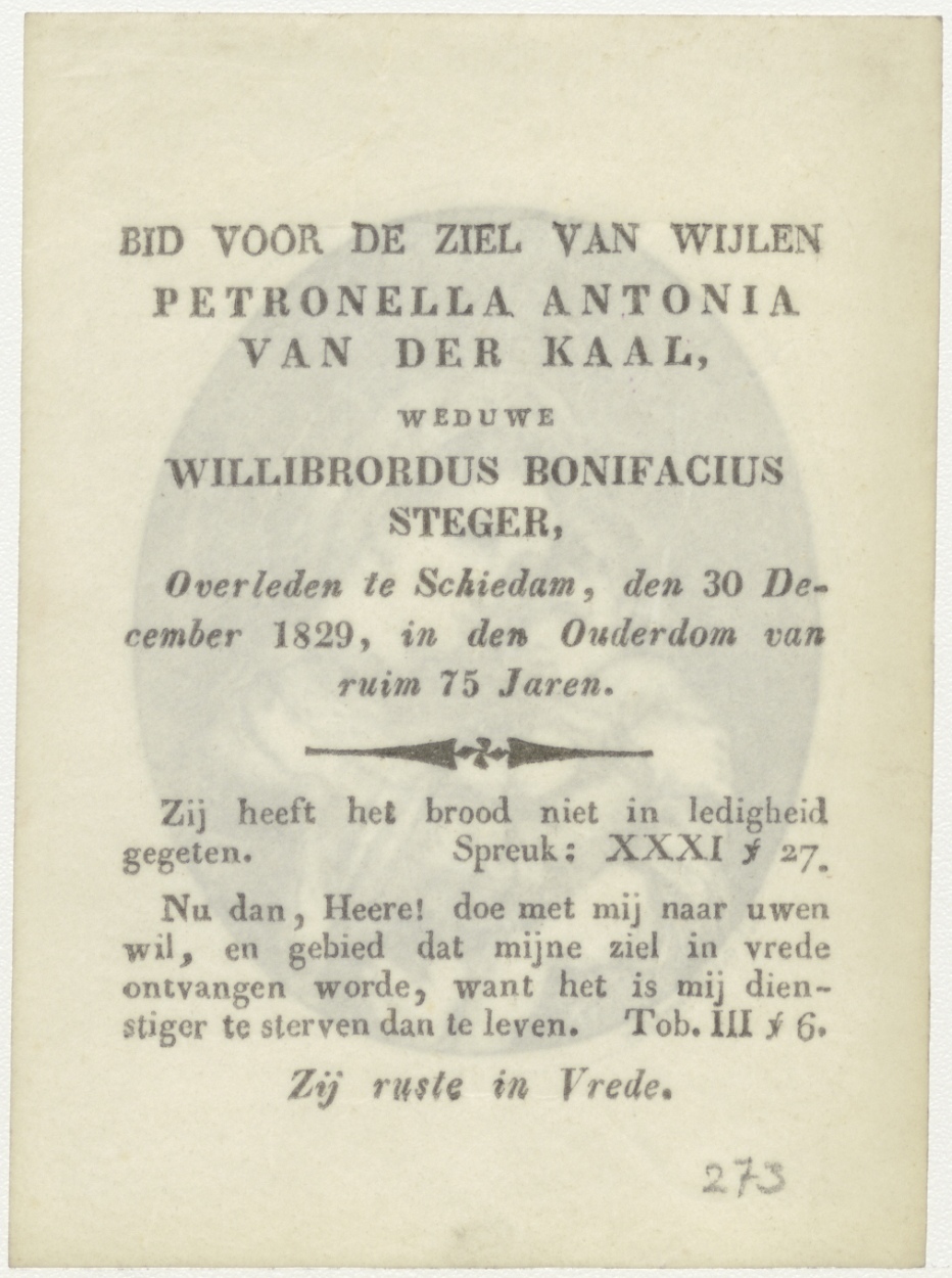 Maria met kind, kz. bid voor ziel Petronella Antonia van der Kaal (+1829) Schiedam, weduwe van Willibrordus Bonifacius Steger