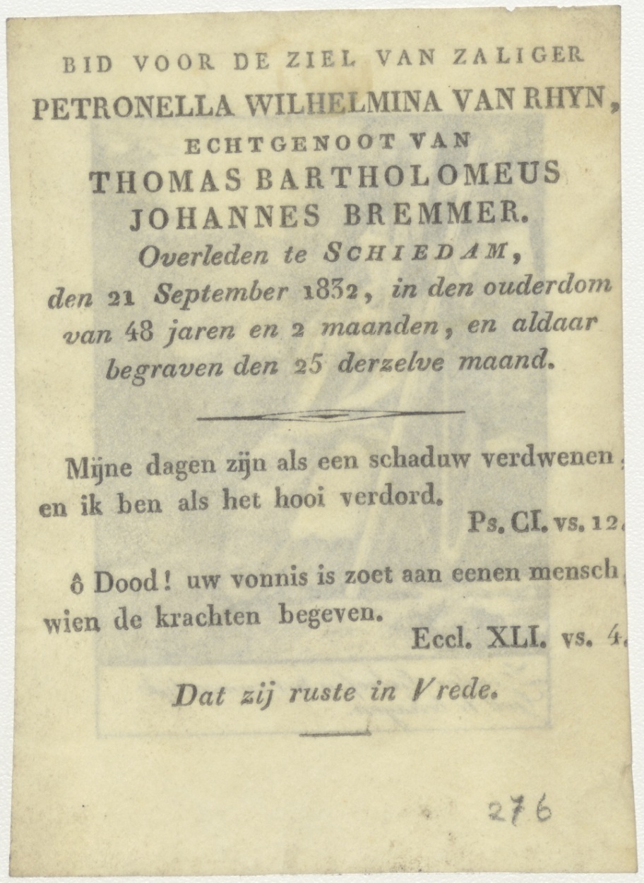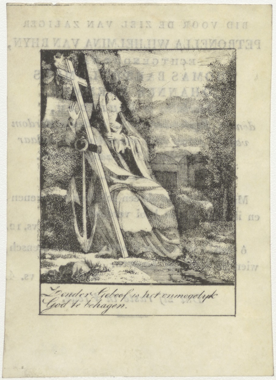 Zonder Geloof is het onmogelijk God te behagen, kz. Bid voor ziel Petronella Wilhelmina van Rhijn (+1832) Schiedam, echtgenoot van Thomas Bartholomeus Johannes Bremmer