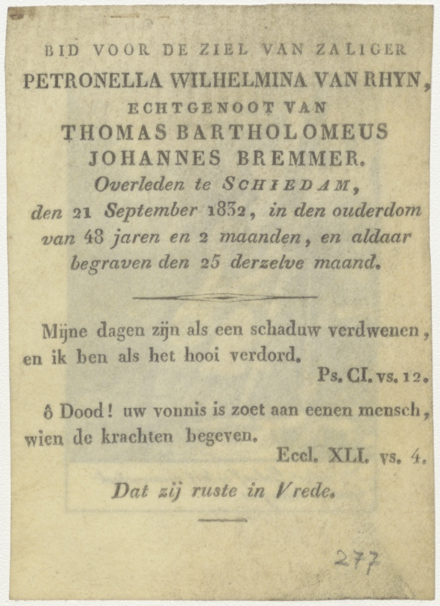 Zonder Geloof is het onmogelijk God te behagen, kz. Bid voor ziel Petronella Wilhelmina van Rhijn (+1832) Schiedam, echtgenoot van Thomas Bartholomeus Johannes Bremmer