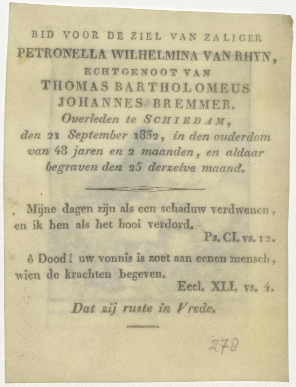 De dood is het begin der eeuwigheid, met kruis, anker en boek, kz. Bid voor ziel Petronella Wilhelmina van Rhijn (+1832) Schiedam, echtgenoot van Thomas Bartholomeus Johannes Bremmer