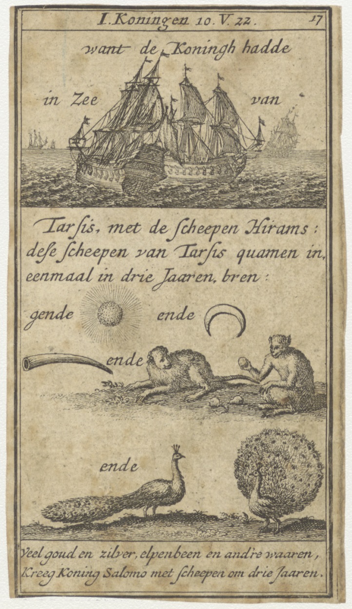 1 Koningen 10 V. 22, want de Koningh hadde in Zee (schepen) van Tarsis, met de scheepen Hirams ..."