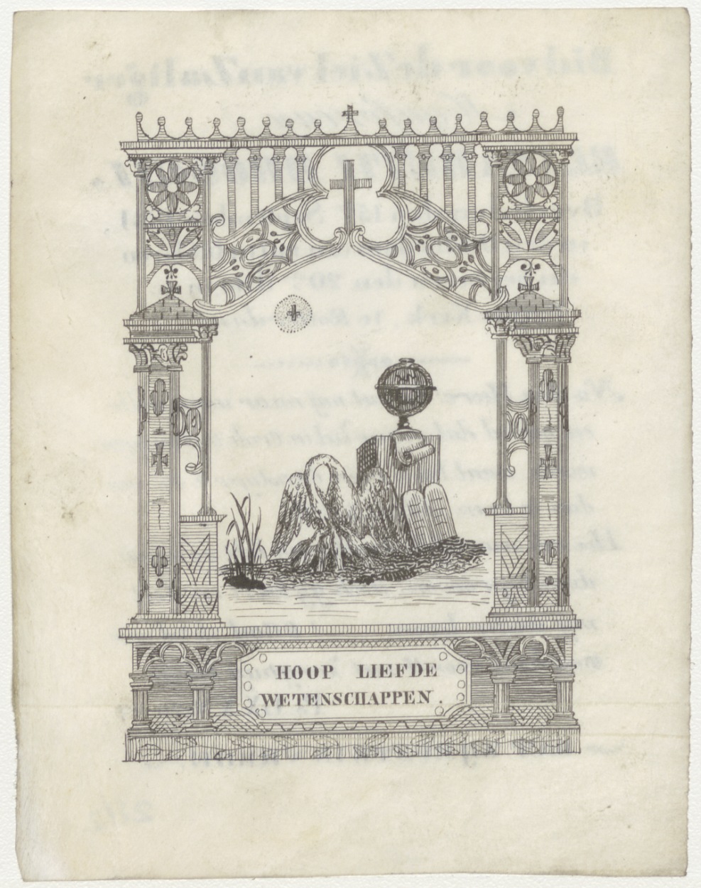 Hoop, liefde, wetenschappen, met pelikaan jongen voedend, wereldbol op sokkel, kz. Bid voor ziel Elisabeth Droogh (+1831) Rotterdam
