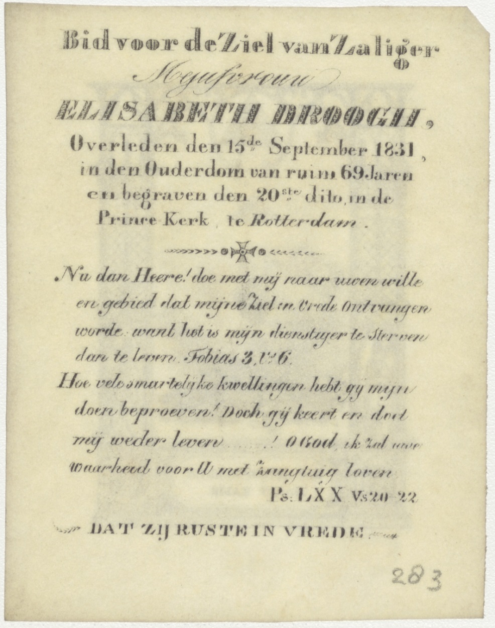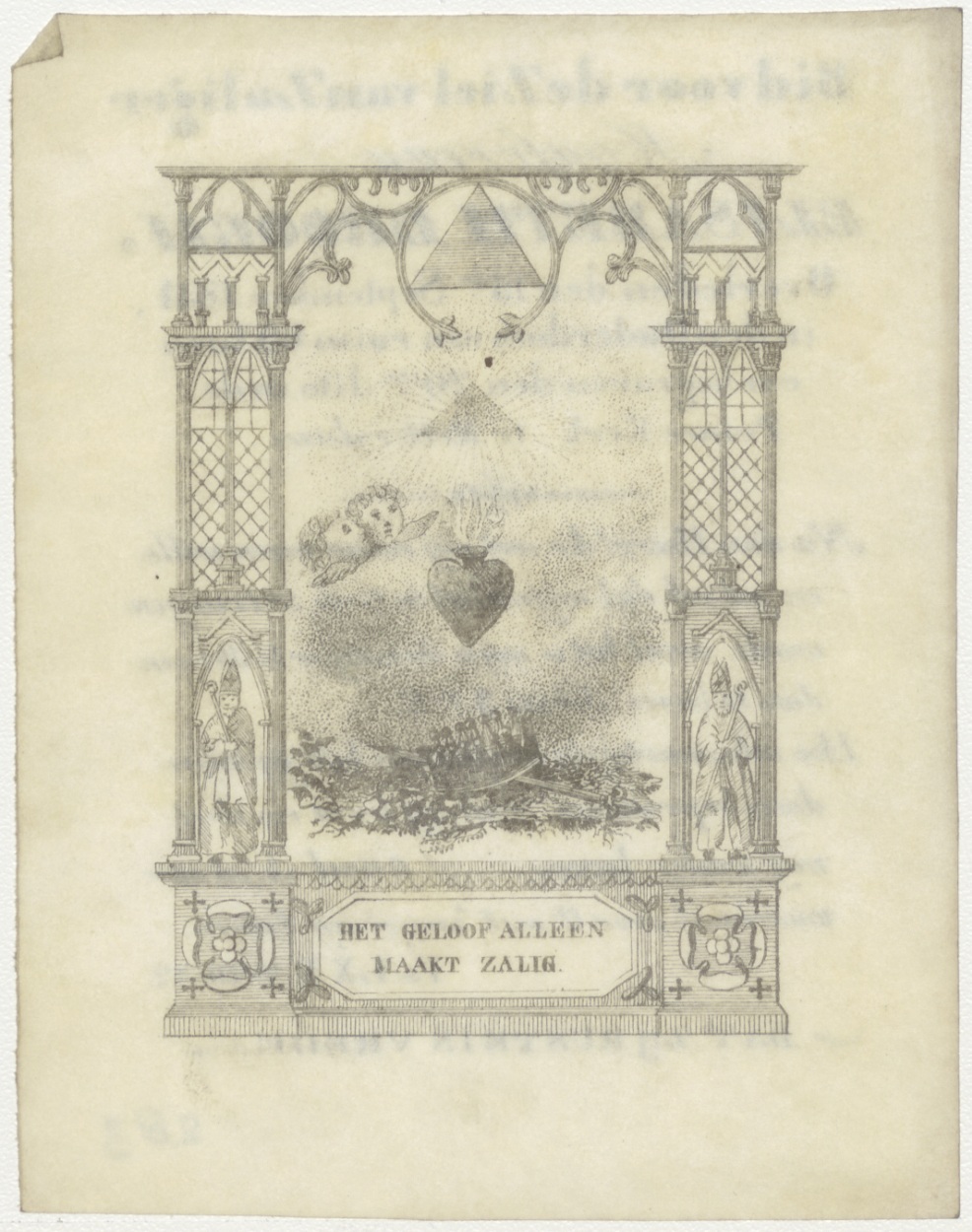 Het geloof alleen maakt zalig, met zwaard en kroon onder H. Hart en Alziend Oog, kz. Bid voor ziel Elisabeth Droogh (+1831) Rotterdam