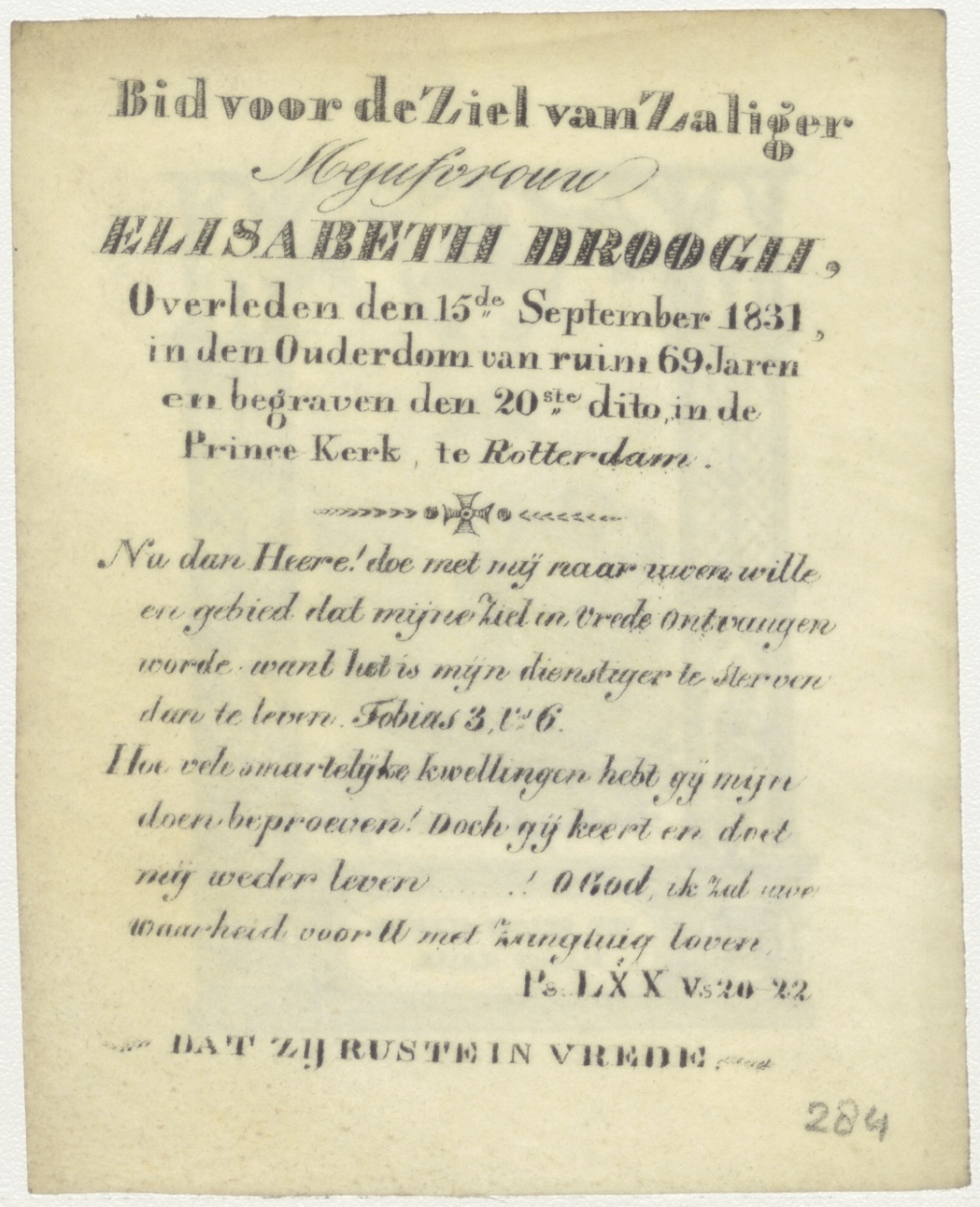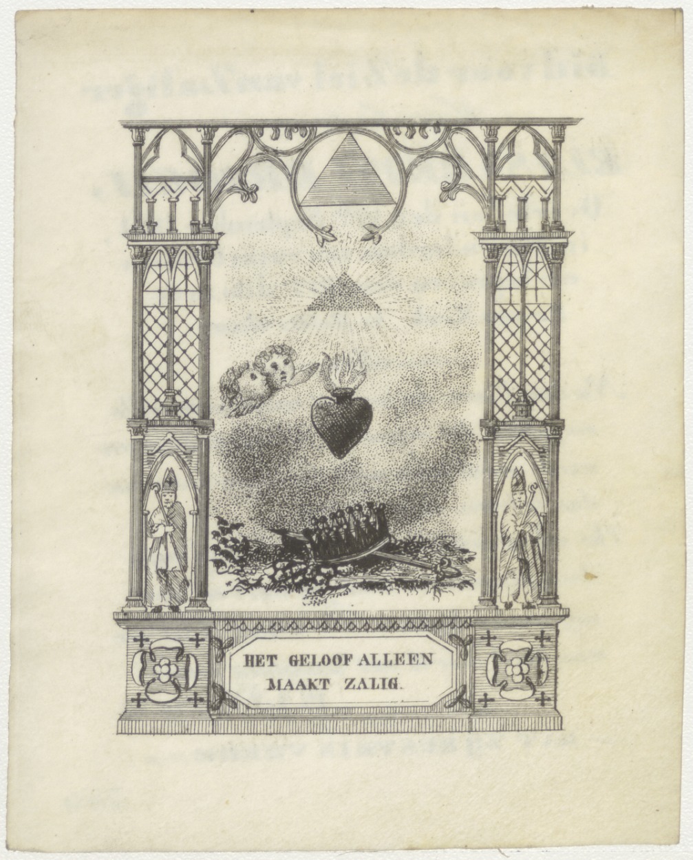 Het geloof alleen maakt zalig, met zwaard en kroon onder H. Hart en Alziend Oog, kz. Bid voor ziel Elisabeth Droogh (+1831) Rotterdam