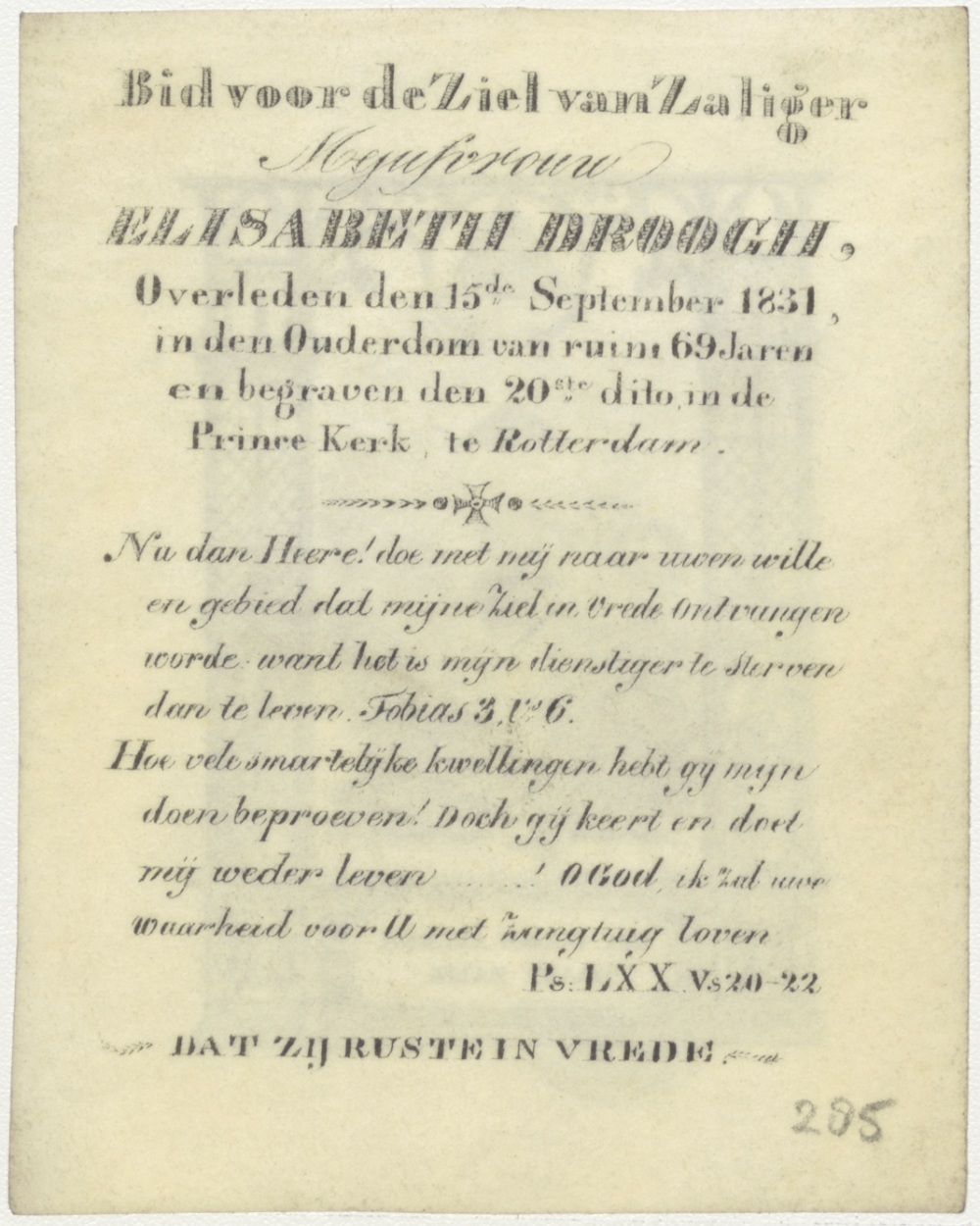 Het geloof alleen maakt zalig, met zwaard en kroon onder H. Hart en Alziend Oog, kz. Bid voor ziel Elisabeth Droogh (+1831) Rotterdam