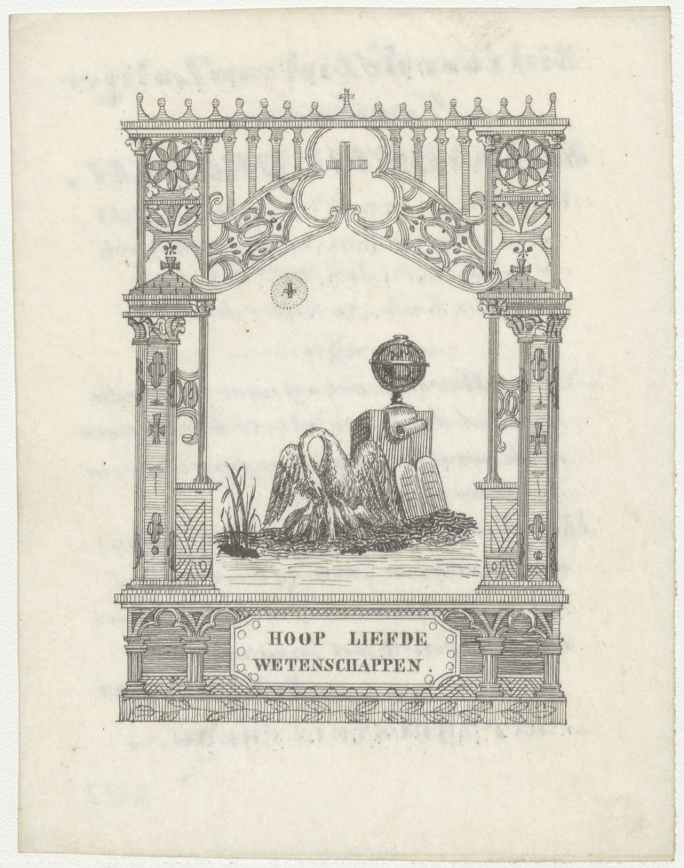 Hoop, liefde, wetenschappen, met pelikaan jongen voedend, wereldbol op sokkel, kz. Bid voor ziel Elisabeth Droogh (+1831) Rotterdam