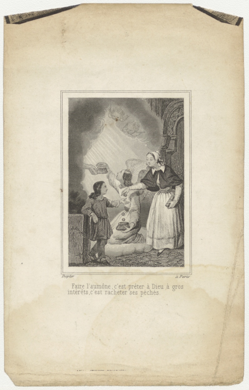 Vrouw geeft geld aan kind, op achtergrond engel met munten, kz. Bid voor ziel Montanus Laurentius Henricus van Albalda de Haan Hettema (+1847);Leeuwarden