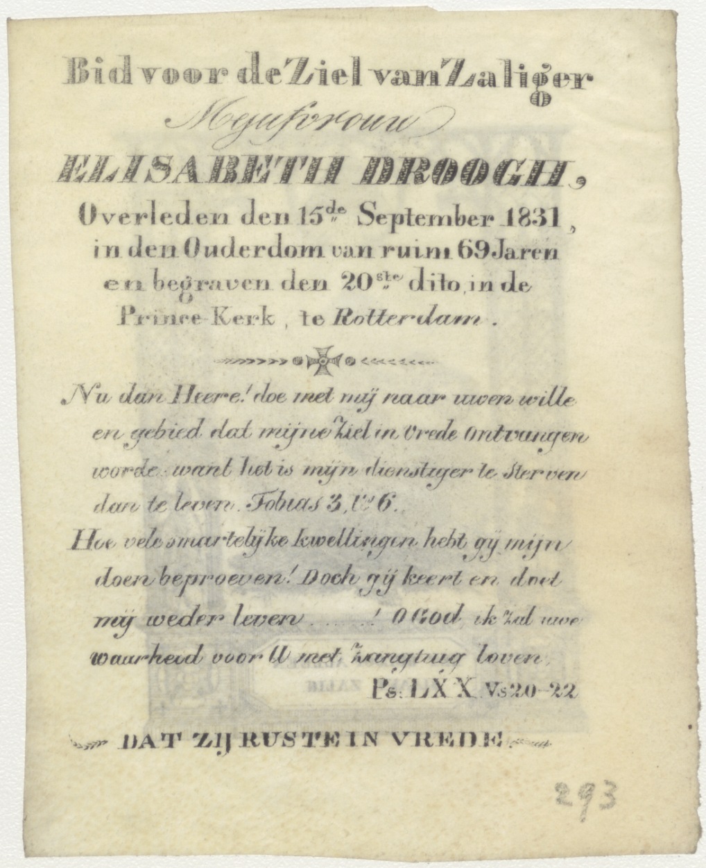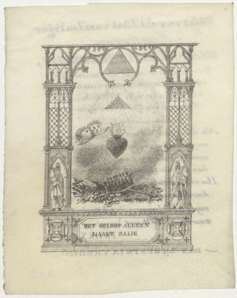 Het geloof alleen maakt zalig, met zwaard en kroon onder H. Hart en Alziend Oog, kz. Bid voor ziel Elisabeth Droogh (+1831) Rotterdam