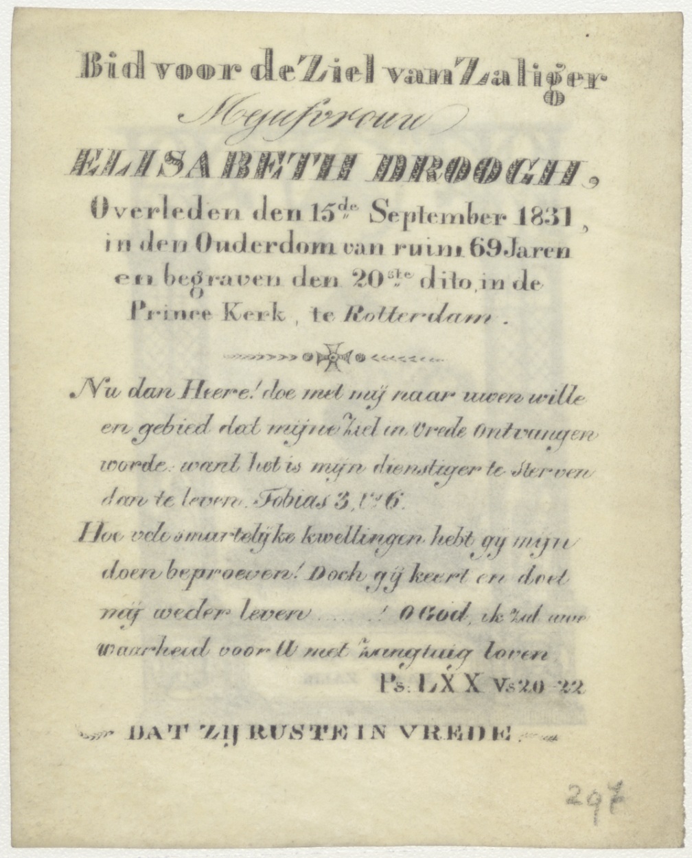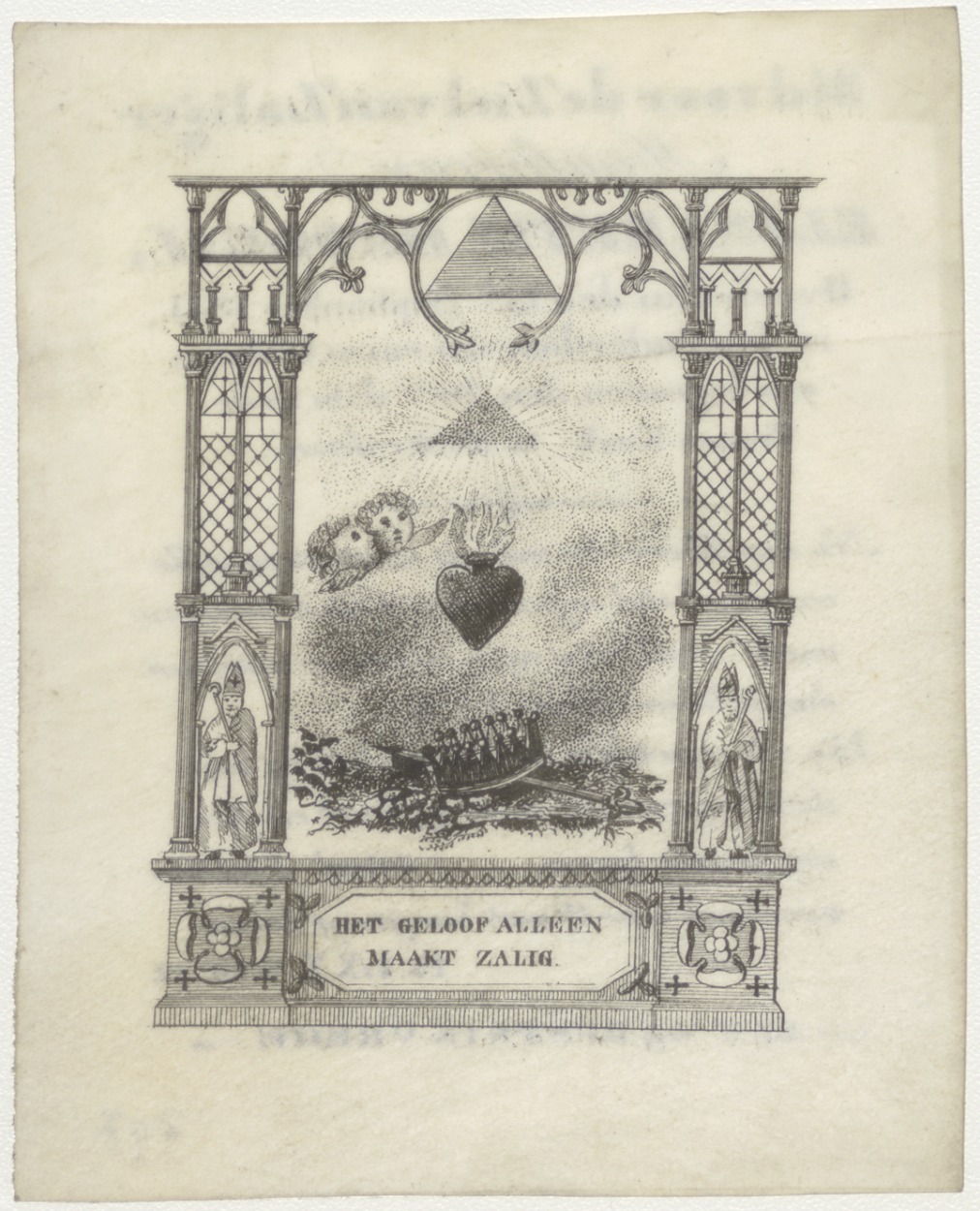 Het geloof alleen maakt zalig, met zwaard en kroon onder H. Hart en Alziend Oog, kz. Bid voor ziel Elisabeth Droogh (+1831) Rotterdam