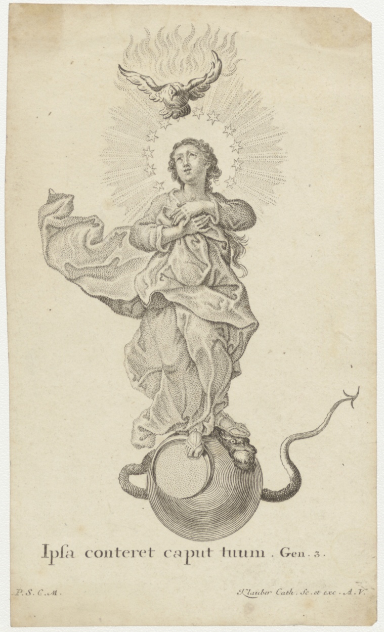 Maria staande op bol, maansikkel en slang, erboven H. Geest