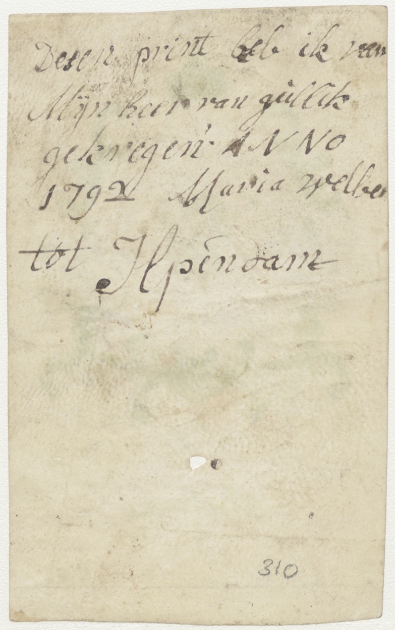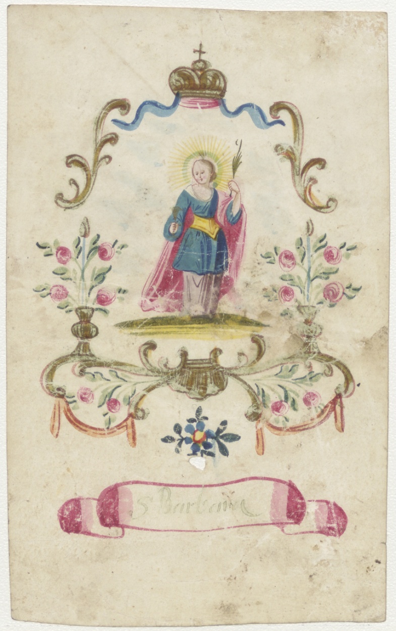 H. Barbara met kelk, ingekleurd, kz. "Deze prent heb ik van mijnheer Van Gullik gekregen anno 1792 Maria Welber tot Ilpendam"