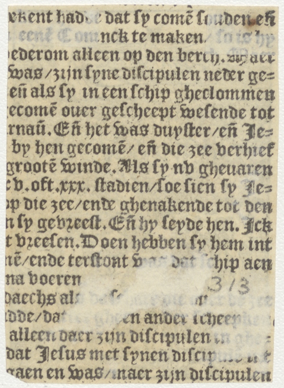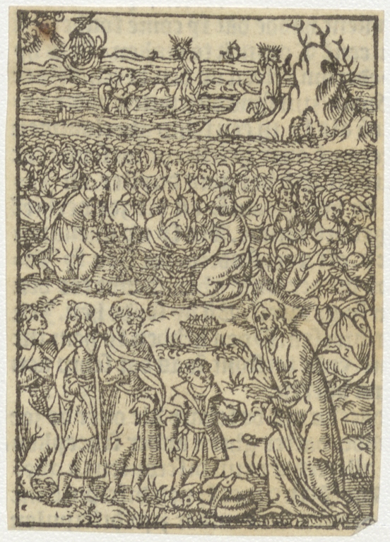 Bijbelprent, de wonderbare broodvermenigvuldiging, kz. tekst