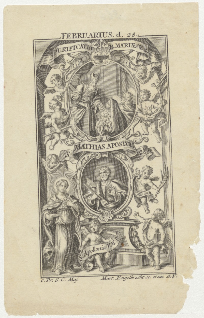 Februarius d. 28, met opdracht in de tempel, St. Matthias en St. Apollonia