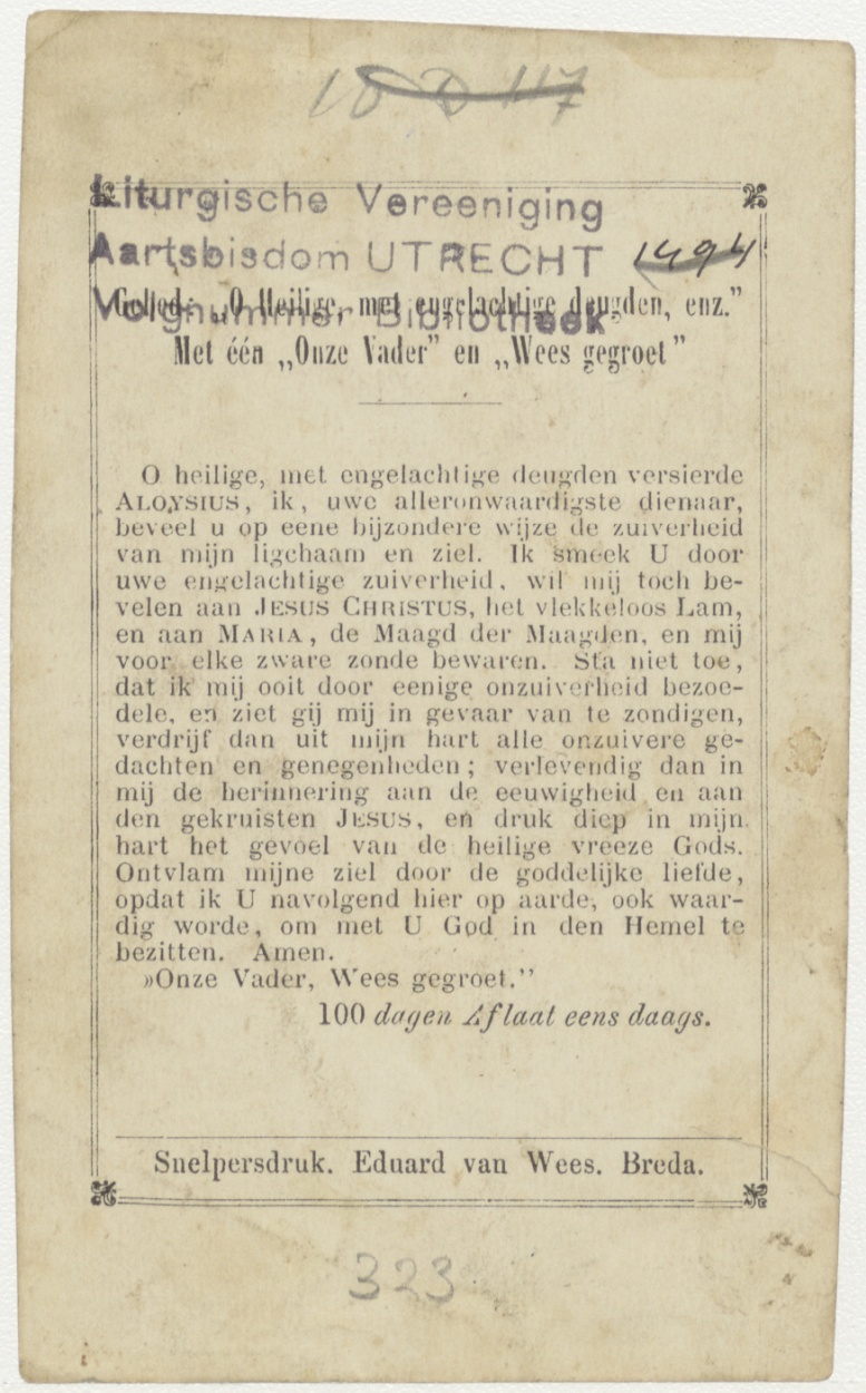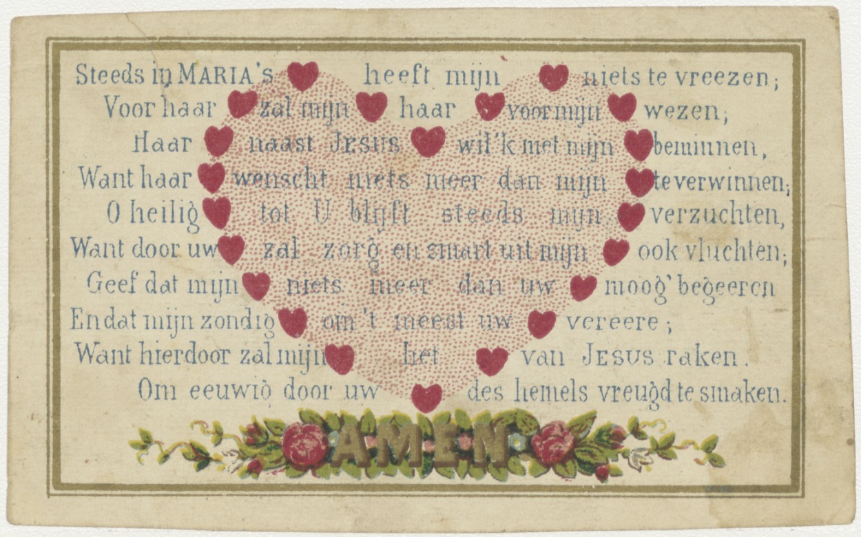 Tekstblad met harten en met gebed "Steeds in Maria's [hart] heeft mijn [hart] niet te vreezen; ... Amen", kz. gebed, 100 dagen aflaat