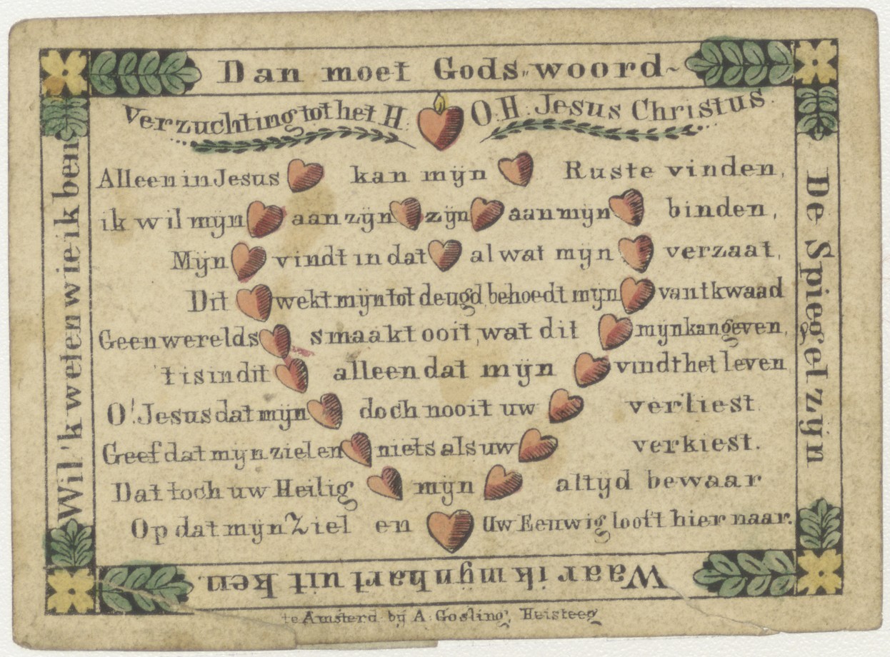 Tekstblad "Verzuchting tot het H. (Hart) ...", waarbij het woord 'hart' herhaald als tekening is weergegeven, rondom met "Dan moet Gods woord de spiegel zijn ...", ingekleurd