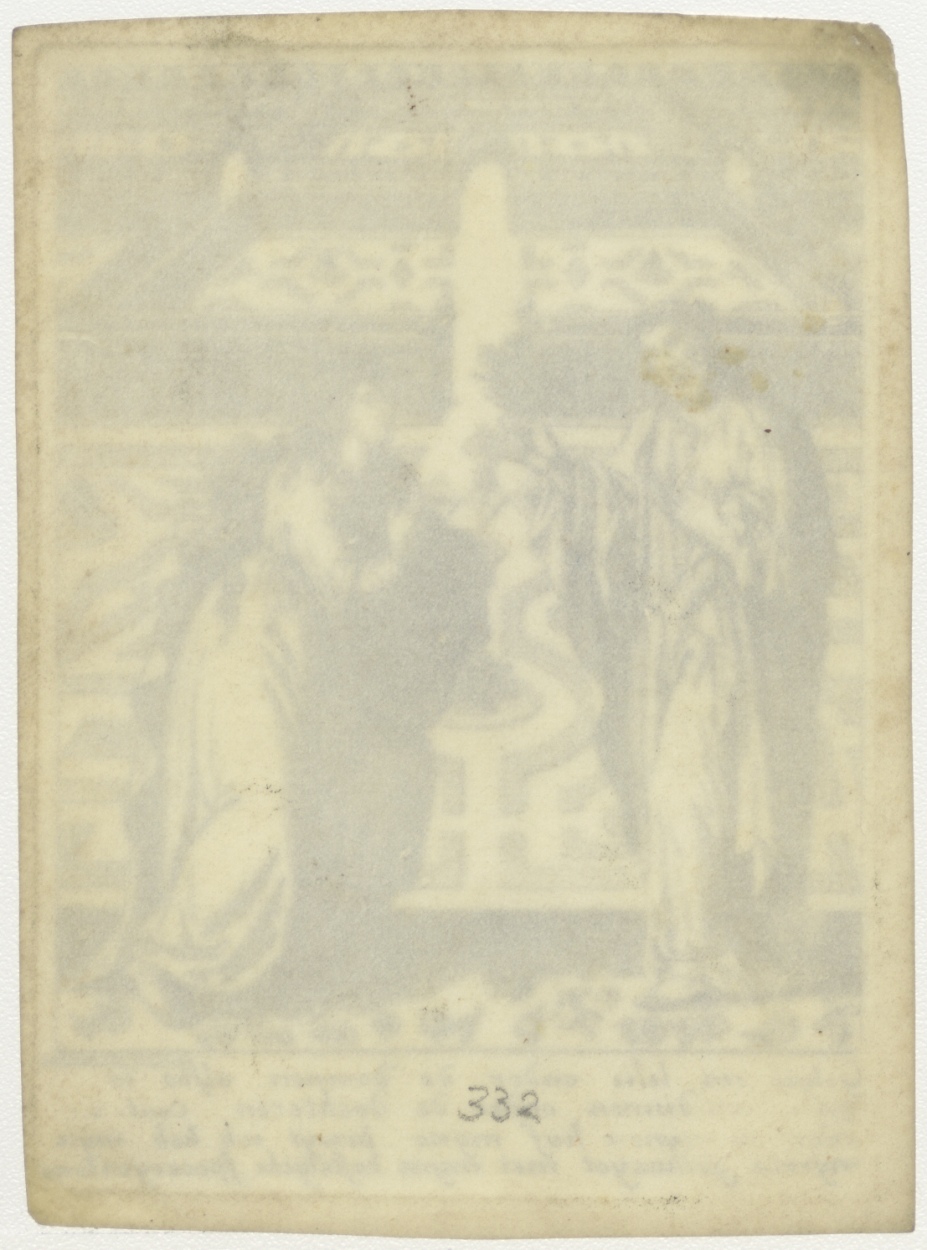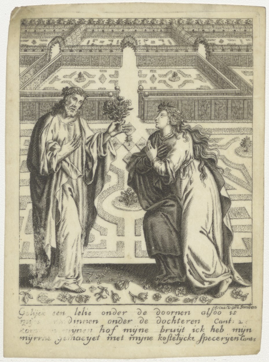 Christus biedt in tuin bloemen aan knielende vrouw, met "Gelijck een lelie onder de doornen ..."