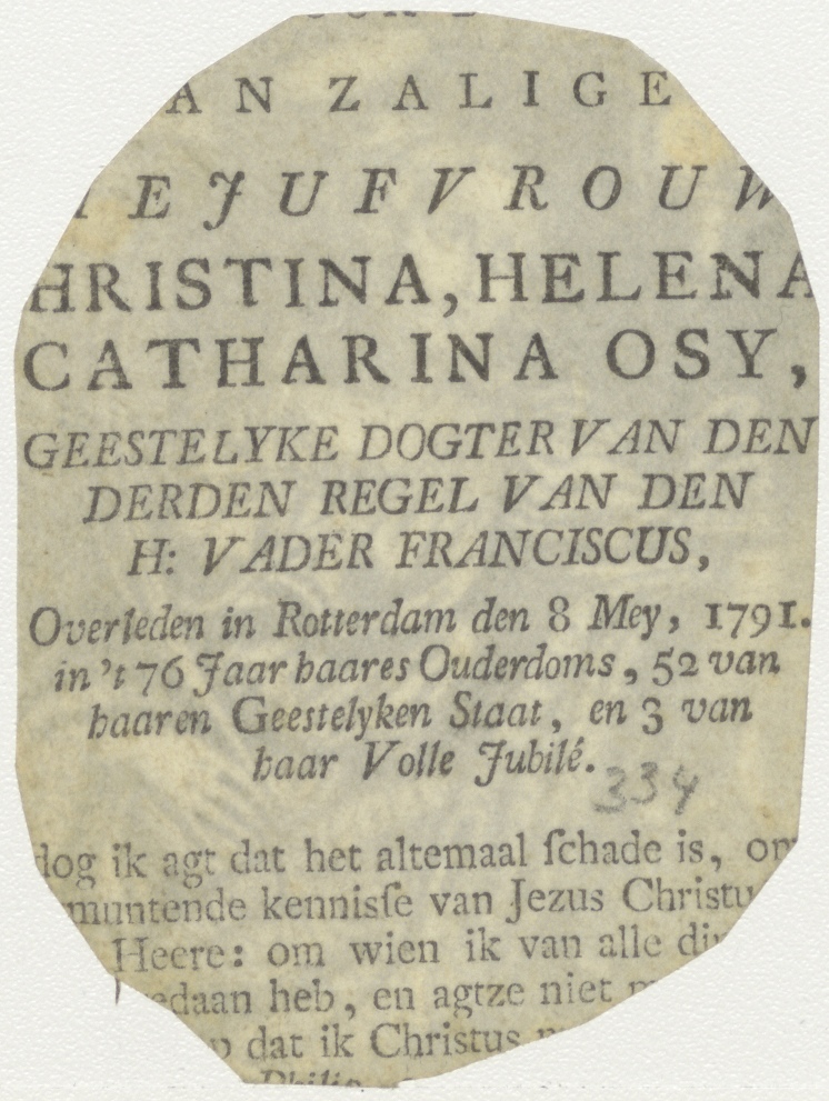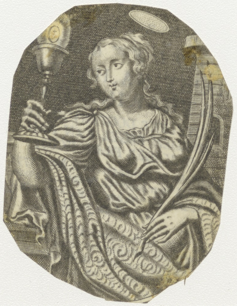 H. Barbara met palmtak, kelk en hostie, kz. Religieus;Bid voor ziel Christina, Helena Catharina Osij (+1791) Rotterdam, geestelijke dochter