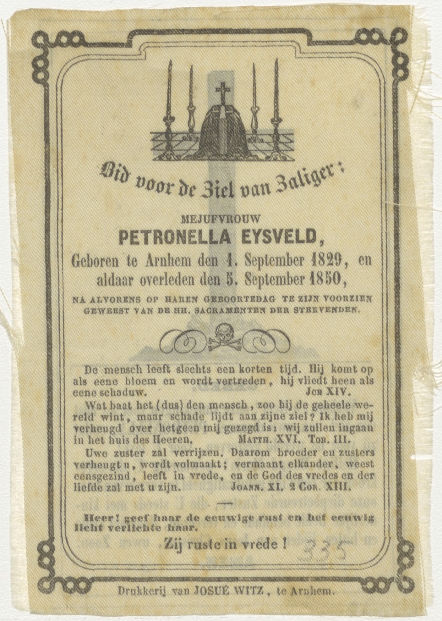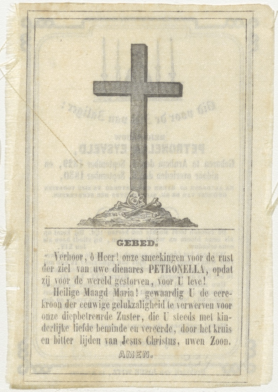 Kruis met schedel aan voet, met gebed, kz. bid voor ziel Petronella Eysveld (+1850) Arnhem