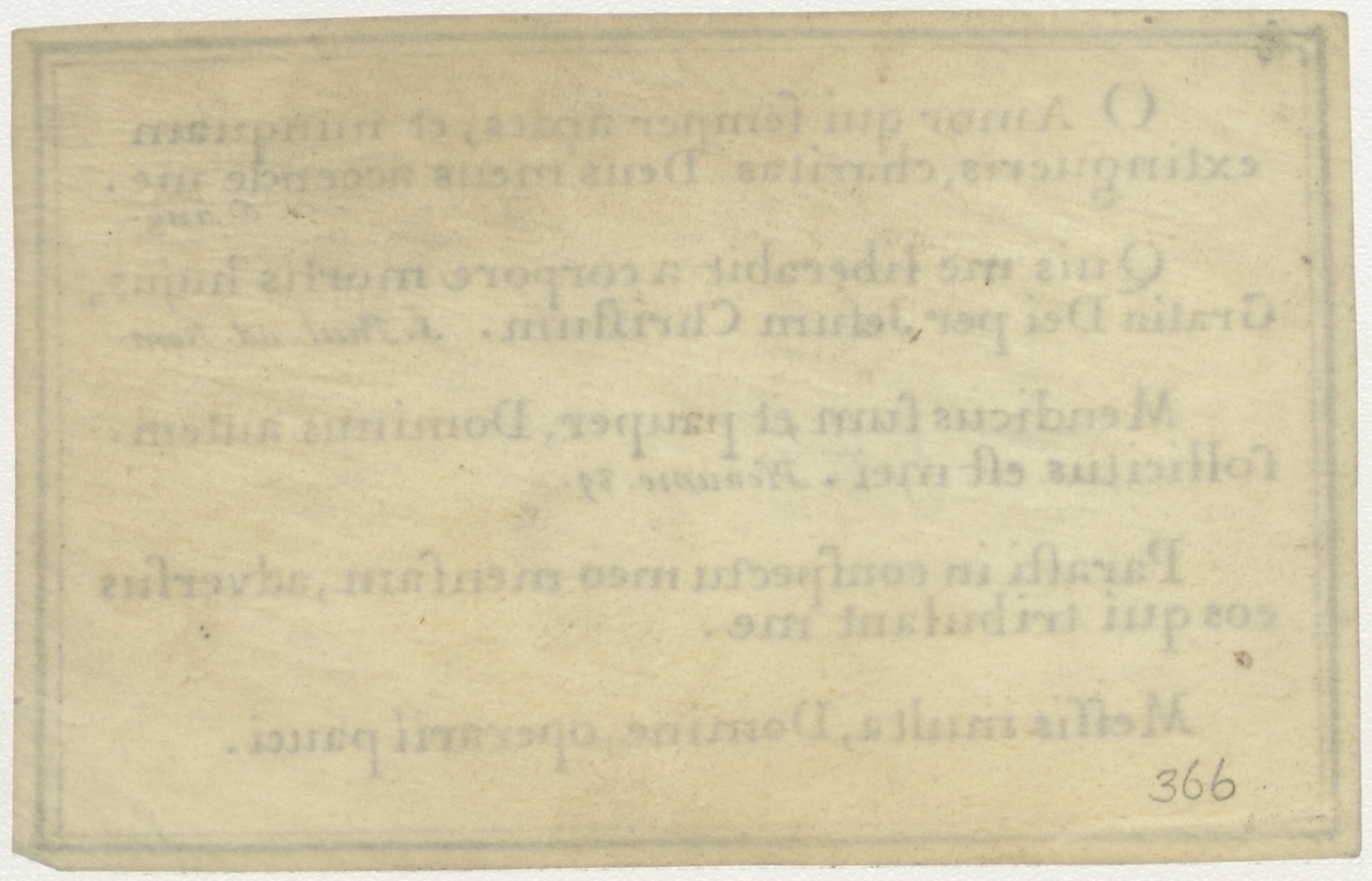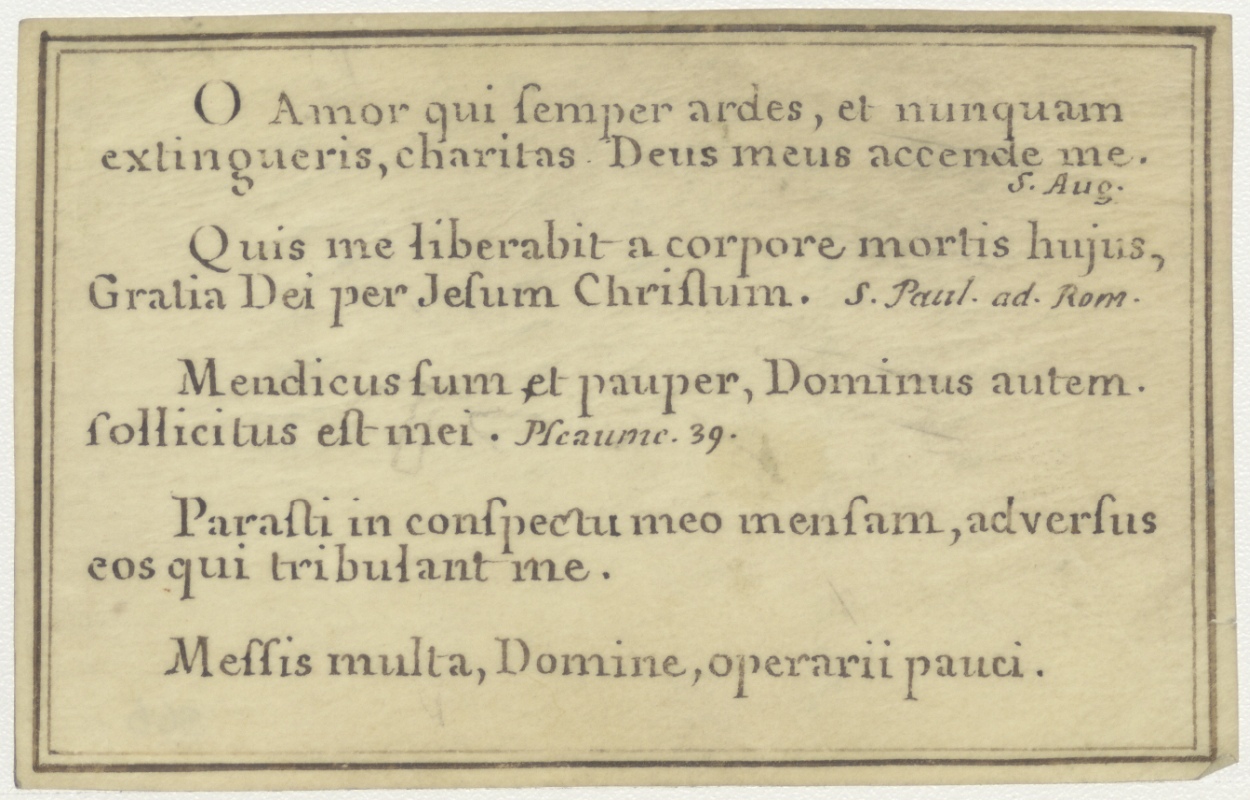Tekstblad met "O Amor qui semper ardes, et nunquam extingueris ..."