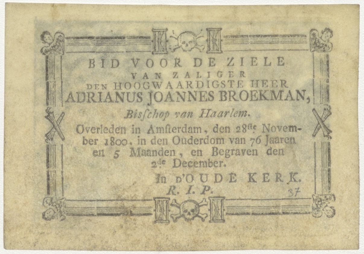 Doop in de Jordaan, kz. Religieus;Bid voor ziel Adrianus Broekman (+1800), bisschop van Haarlem van de Clerezij;Amsterdam