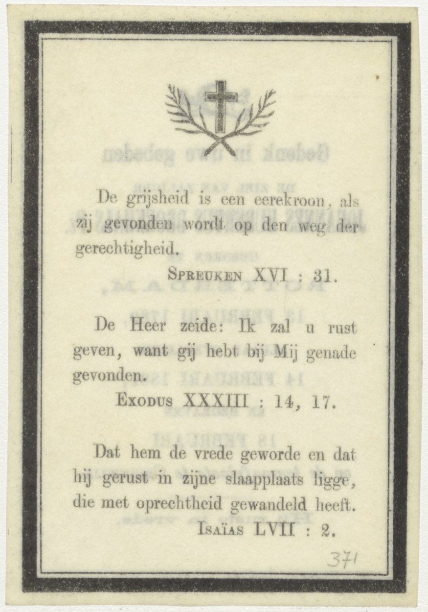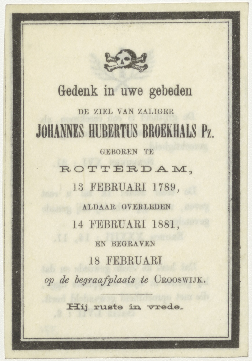 De grijsheid is een eerekroon ..., kz. gedenk in uwe gebeden de ziel van Johannes Hubertus Broekhals Pz. (+1881) Rotterdam