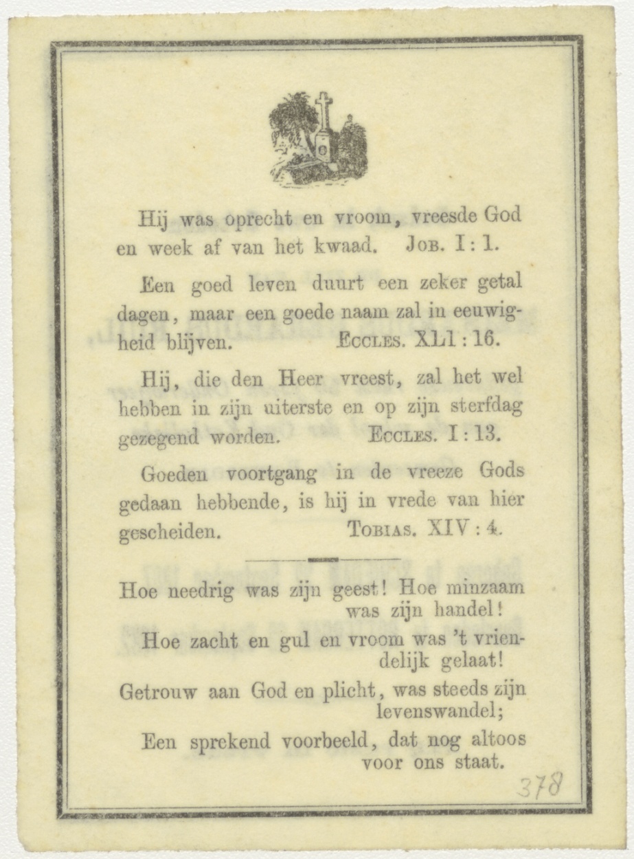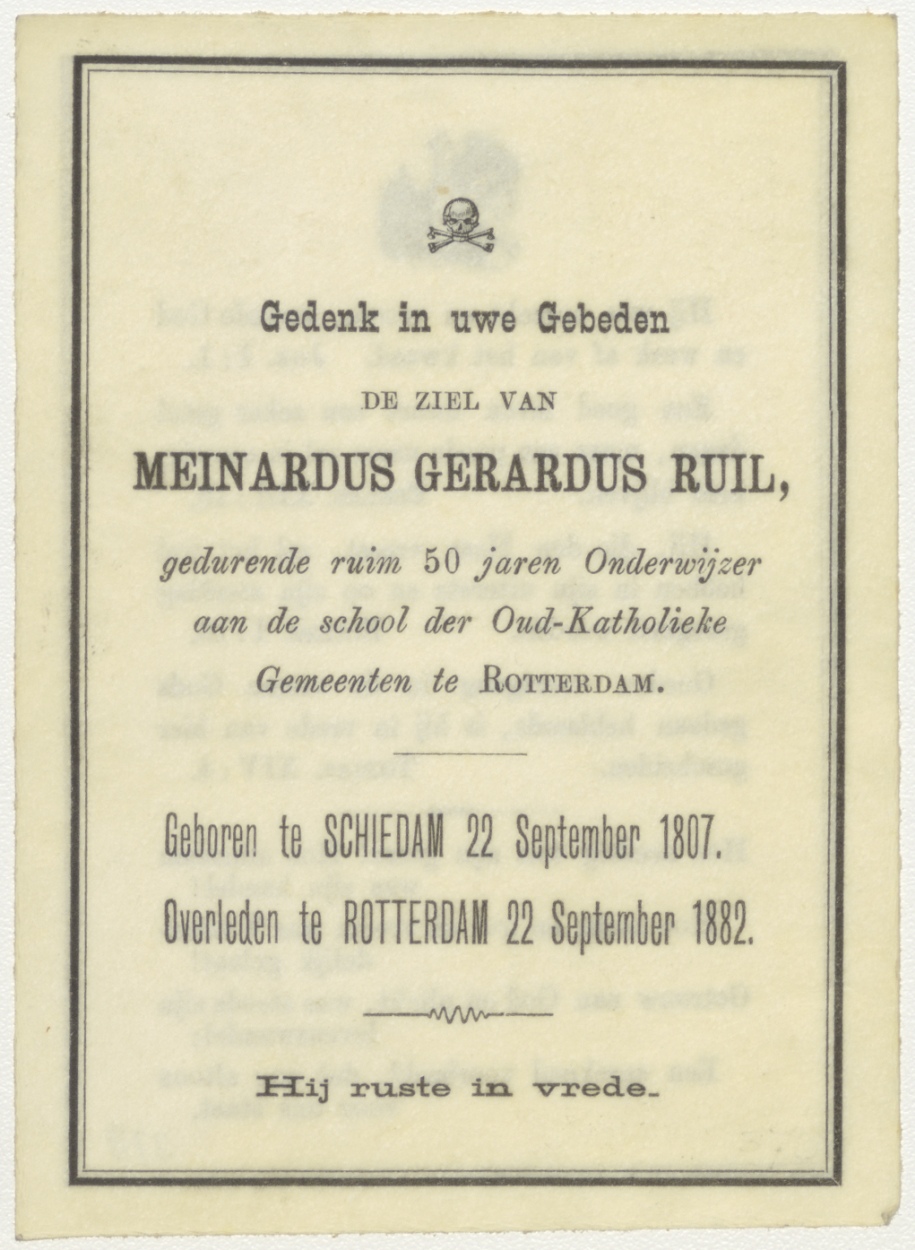 Gedenk in uwe gebeden ... Meinardus Gerardus Ruil (+1882) Rotterdam, onderwijzer school der Oud-Katholieke Gemeenten Rotterdam, kz. bijbelteksten, gedicht