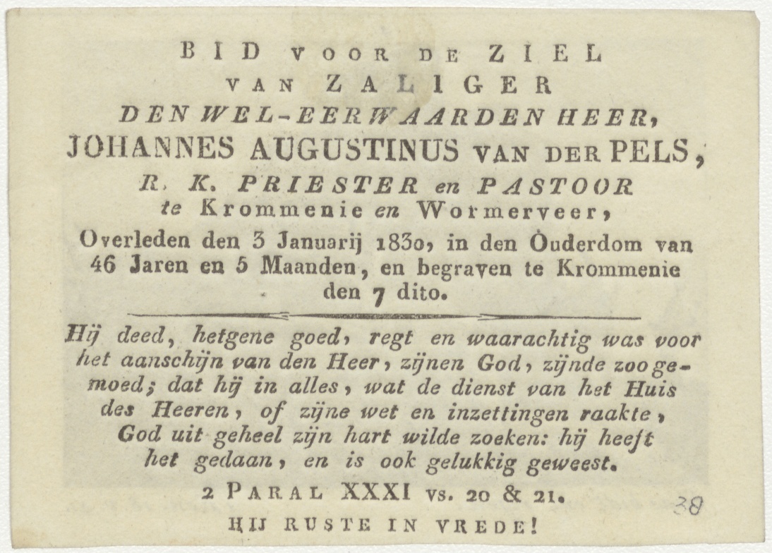 Elias bidt om regen (1 Kon.18:41), kz. Religieus; bid voor ziel Johannes Augustinus van der Pels (+1830) Krommenie, pastoor te Krommenie, Wormerveer
