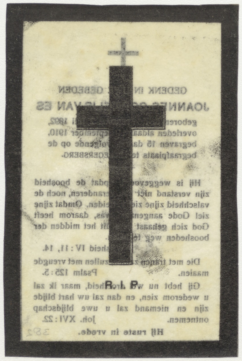 Kruis met "R.I.P.", kz. bid voor ziel Joannes Cornelis van Es (+1910) Hillegersberg