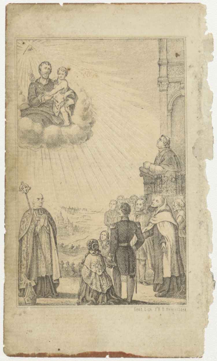 Jozef met kind in wolk boven bisschop, paus en anderen