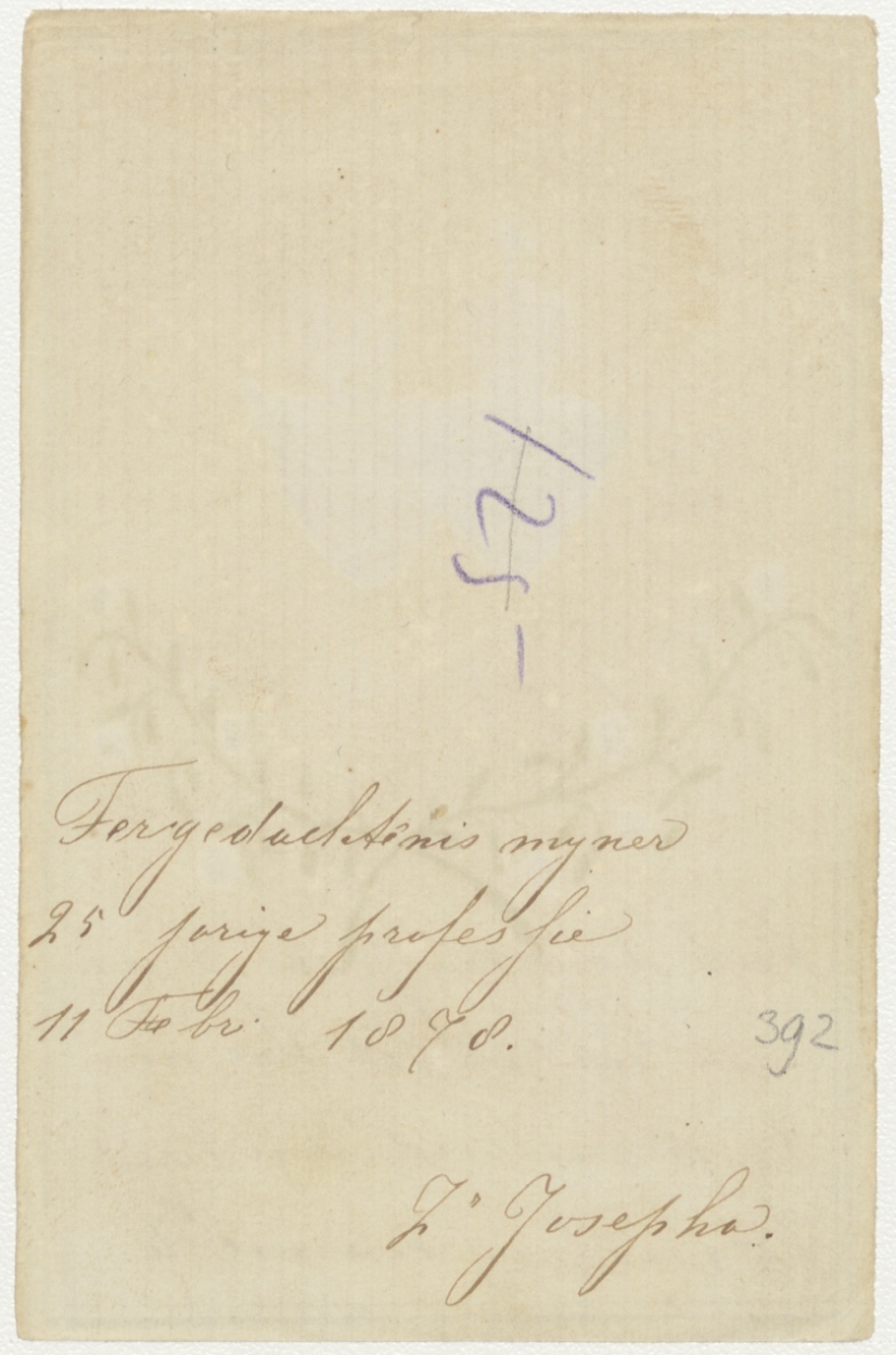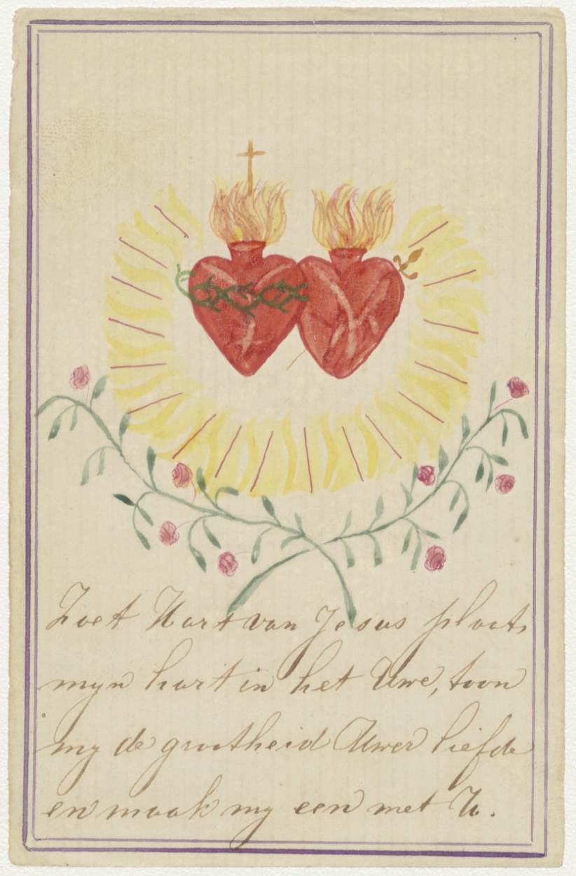Twee H. Harten met "Zoet Hart van Jesus plaats mijn hart in het Uwe ...", kz. "Ter gedachtenis mijner 25 jarige professie 11 febr. 1878 Zr. Josepha"