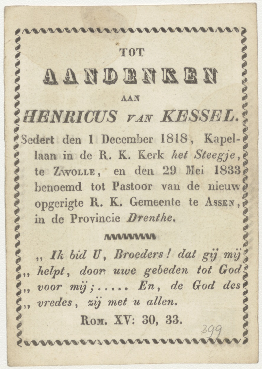 H. Gregorius de Grote, kz. "Tot aandenken aan Henricus van Kessel ... 29 mei 1833 benoemd tot pastoor van de nieuw opgerigte R.K. Gemeente te Assen ..."