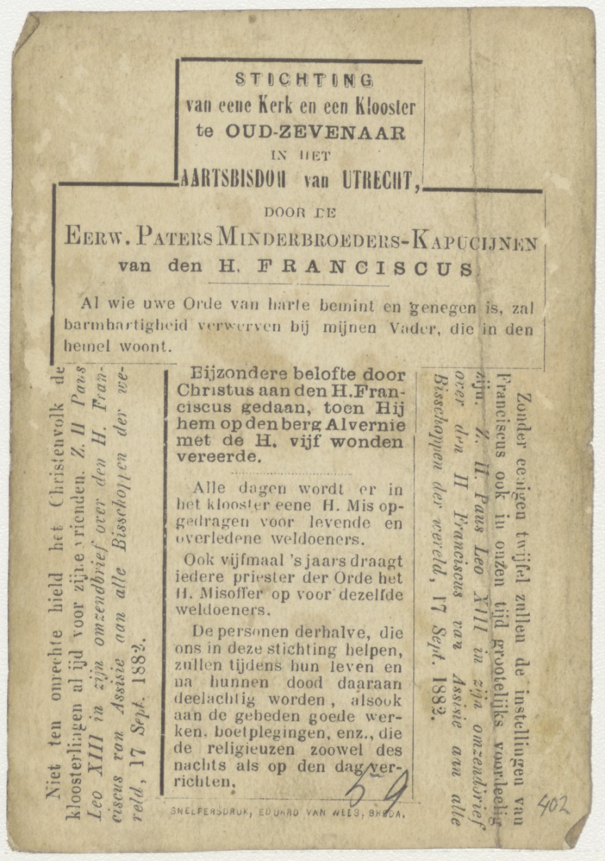 Klooster en openbare kapel ter eere van den H. vader Franciscus te Oud-Zevenaar, kz. "Stichting van eene kerk en klooster te Oud-Zevenaar in het aartsbisdom van Utrecht ..."
