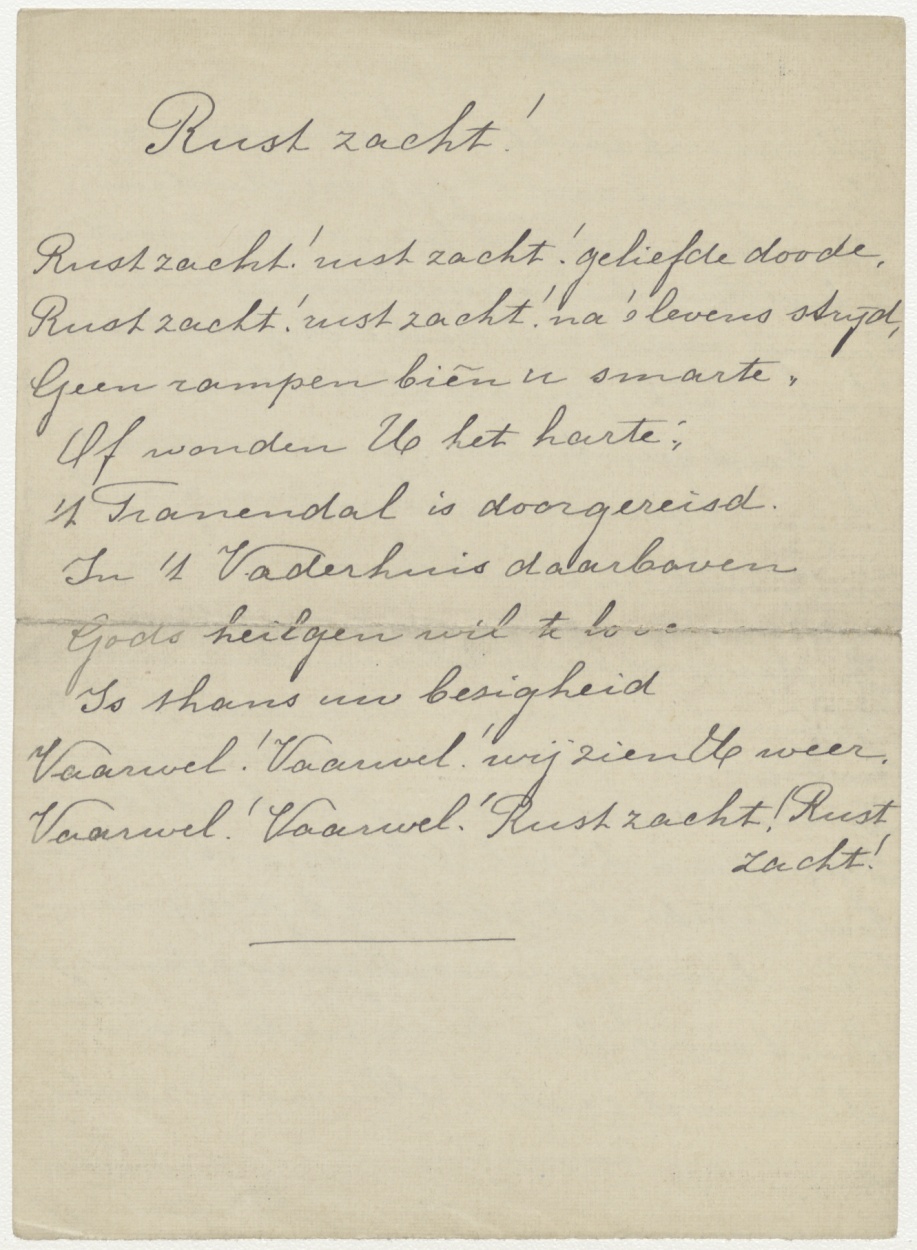 Rust zacht! ... geliefde doode ... na 's levens strijd ..., kz. Onze dooden Sluimert zacht! ..."