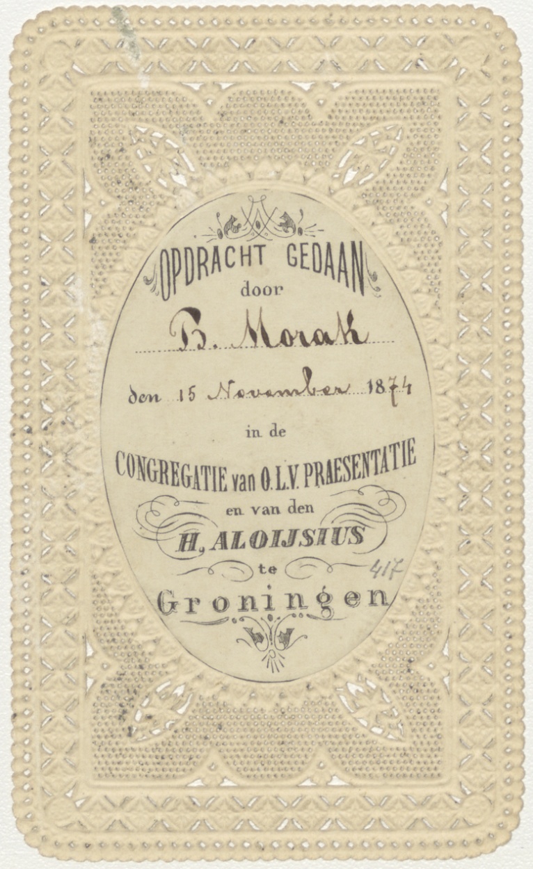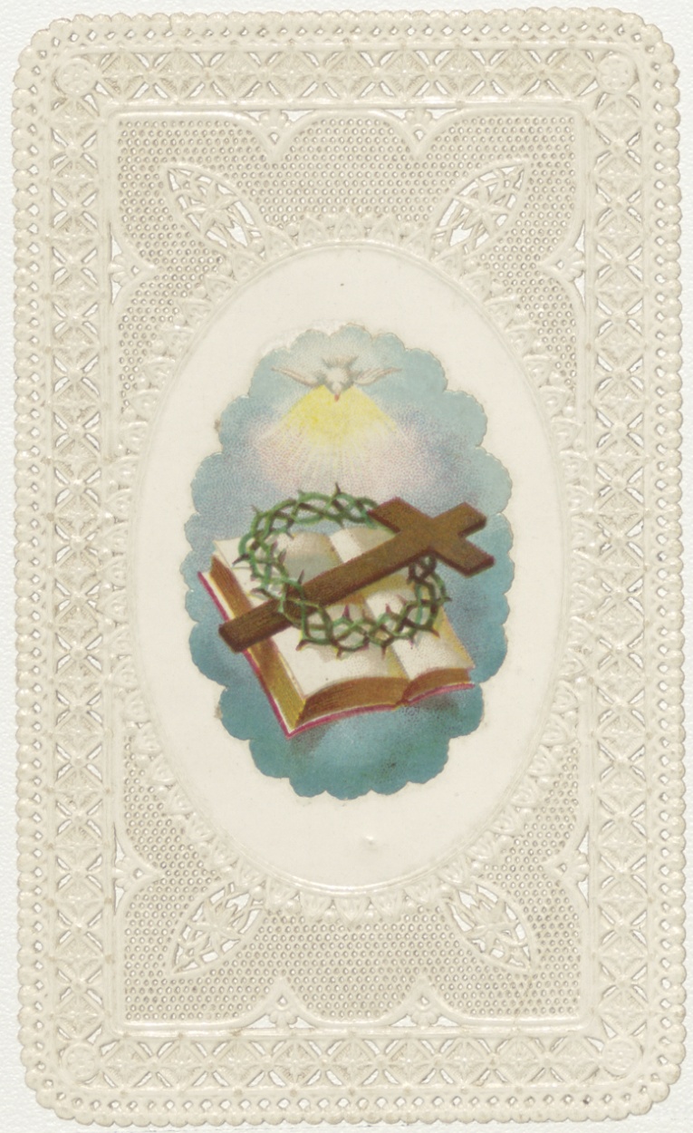 Bijbel, doornenkroon met kruis en H. Geest, kz. Opdracht gedaan door H. Morak den 15 november 1874 congregatie van O.L.V. Praesentatie en van den H. Aloijsius te Groningen