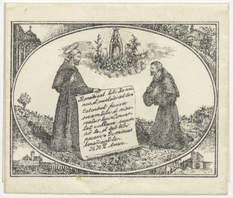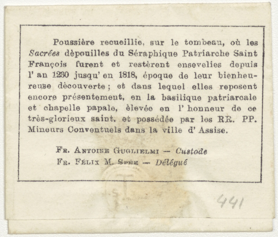 Envelop waarin stof uit de tombe van H. Franciscus, met H. Franciscus in ovaal met "Benedicat tibi Dominus, et custodiat te ...", kz. tekst "Poussière ... jusqu' en 1818 ... Antoine Guglielmi custode ... Félix M. ... délégué"