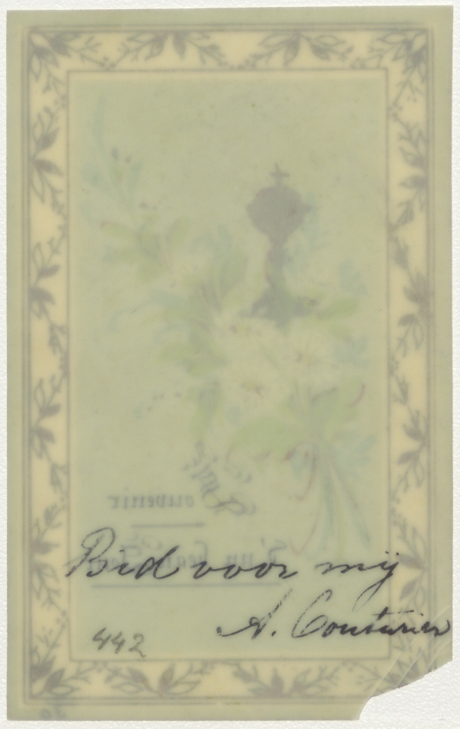 Communieprent met ciborie en witte bloemen, kz. met "Bid voor mij A. Couturier"