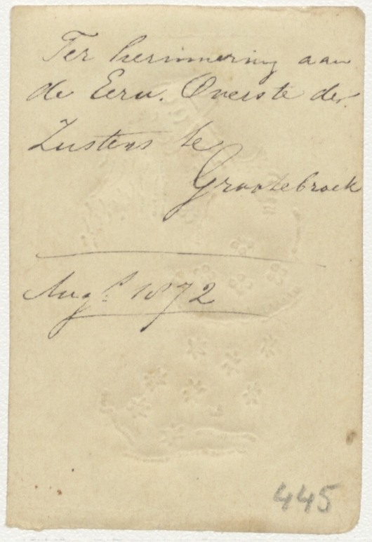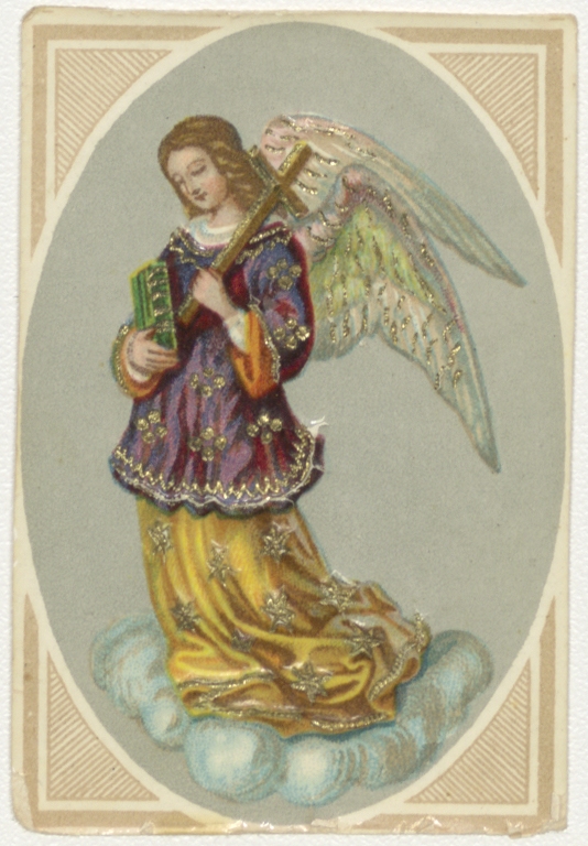 Engel op wolk met boek en kruis in de handen, kz. "Ter herinnering aan de eerw. overste der zusters te Grootebroek aug 1872"